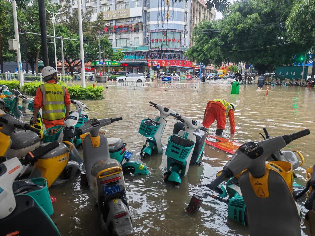 受暴雨影響,南寧市部分城區發生內澇,一些低洼地帶積水較深。記者在南寧市青秀區東葛路一帶看到,一些地方積水深度為0.5米左右,不少電動單車側倒在馬路兩邊,有數輛小汽車熄火停在路中間。一名群眾告訴記者,19日凌晨3時左右突降暴雨,大量雨水灌入地勢較低的地下車庫,一些來不及轉移的車輛被淹。