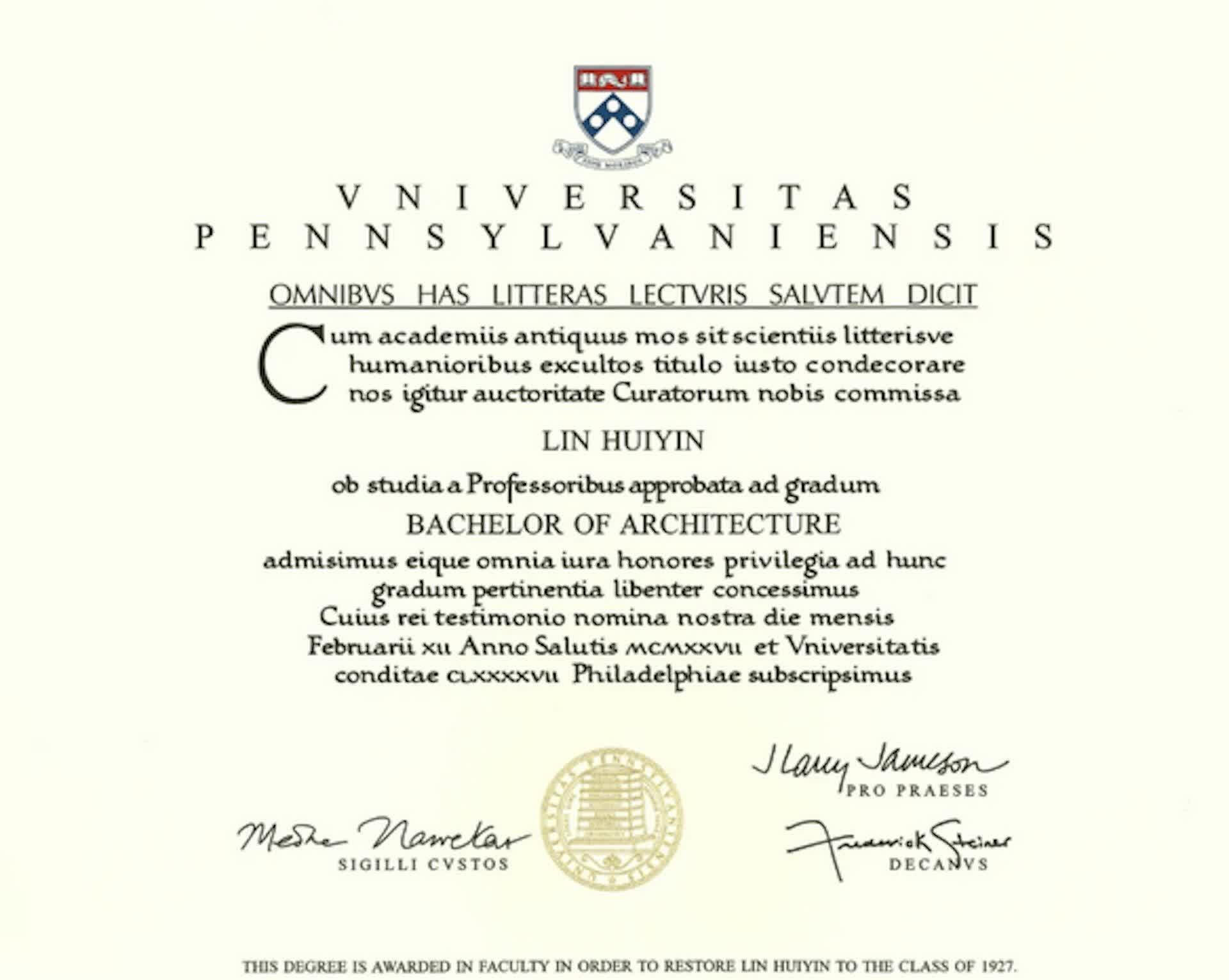 1924年,賓夕法尼亞大學建築系以部分課程不適合女性修讀為由,拒絕了林徽因的入學申請,她只能進入美術系,畢業時獲美術學學士學位。