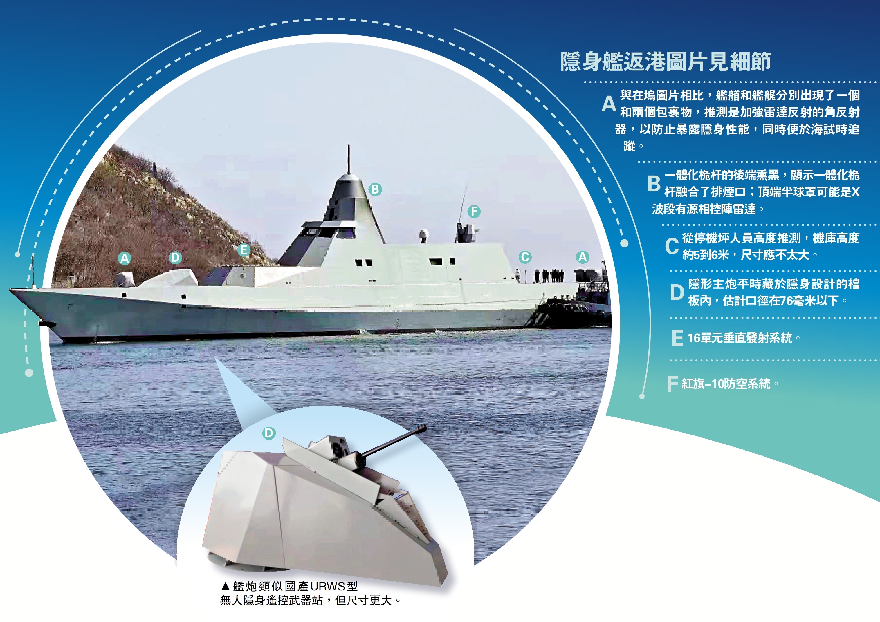 該型全隱身艦去年11月下水。艦長約97米,比056A型導彈護衛艦略長,排水量約2000噸,亦稍高於1500噸的056A型。其隱身性能則全面超越了現役所有水面戰艦,做到了全方位隱身,將雷達波反射降到了最低。