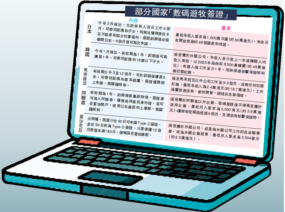 香港文匯報報道,隨着全球掀起「數碼遊牧」(Digital Nomads)熱潮,各地政府藉此參與搶奪人才,紛紛推出「數碼遊牧簽證」,允許來自外地的人士在本國居住和遙距辦公。據《金融時報》報道,現時已有多達58個國家推出「數碼遊牧簽證」,當中美國籍的數碼遊牧族最多,在2023年時已達到1,730萬。企業服務顧問公司MBO Partners的研究員史蒂夫表示,許多國家還將從事傳統工作的數碼遊牧族,視作在當地進行大量消費的旅客,他們不會搶佔當地工作機會或成為社會服務的負擔。