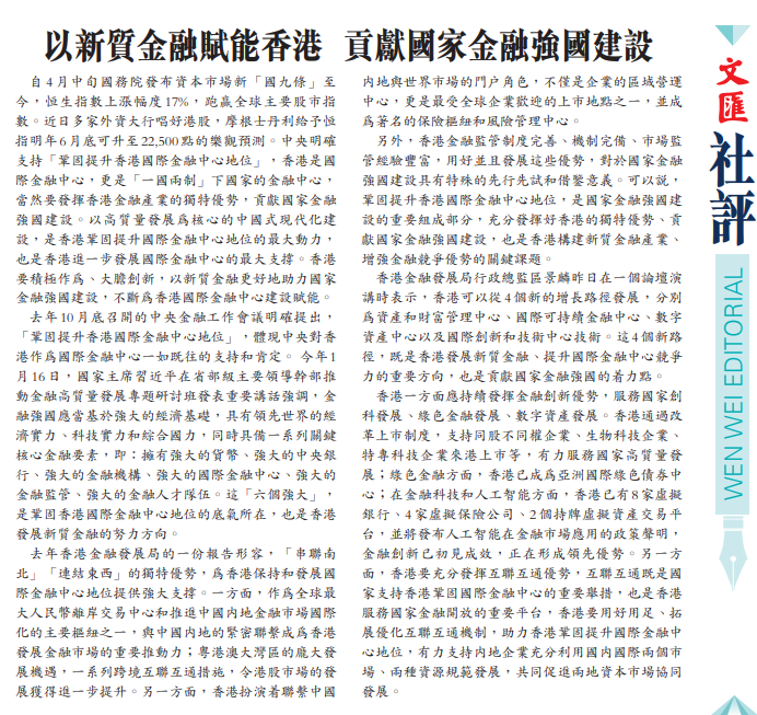 自4月中旬國務院發布資本市場新「國九條」至今,恒生指數上漲幅度17%,跑贏全球主要股市指數。近日多家外資大行唱好港股,摩根士丹利給予恒指明年6月底可升至22,500點的樂觀預測。中央明確支持「鞏固提升香港國際金融中心地位」,香港是國際金融中心,更是「一國兩制」下國家的金融中心,當然要發揮香港金融產業的獨特優勢,貢獻國家金融強國建設。以高質量發展為核心的中國式現代化建設,是香港鞏固提升國際金融中心地位的最大動力,也是香港進一步發展國際金融中心的最大支撐。香港要積極作為、大膽創新,以新質金融更好地助力國家金融強國建設,不斷為香港國際金融中心建設賦能。
