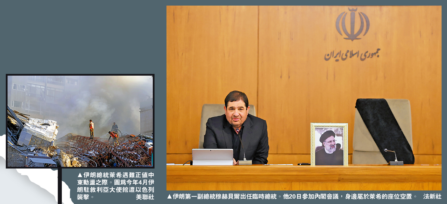 大公報綜合外媒報道,伊朗總統萊希和外長阿卜杜拉希揚等官員19日在直升機事故中遇難,伊朗第一副總統穆赫貝爾出任臨時總統,首席核談判代表巴蓋里暫代外長職務。萊希被視為伊朗最高領袖哈梅內伊的潛在繼任者,有分析認為,他的意外去世或將造成伊朗最高領袖繼任者暫時空缺,但伊朗政局不會出現明顯動盪,內政外交方向預計不會發生太大改變。不過,伊朗和美國關於巴以衝突的談判可能陷入停滯,為地區局勢帶來更多不確定性。