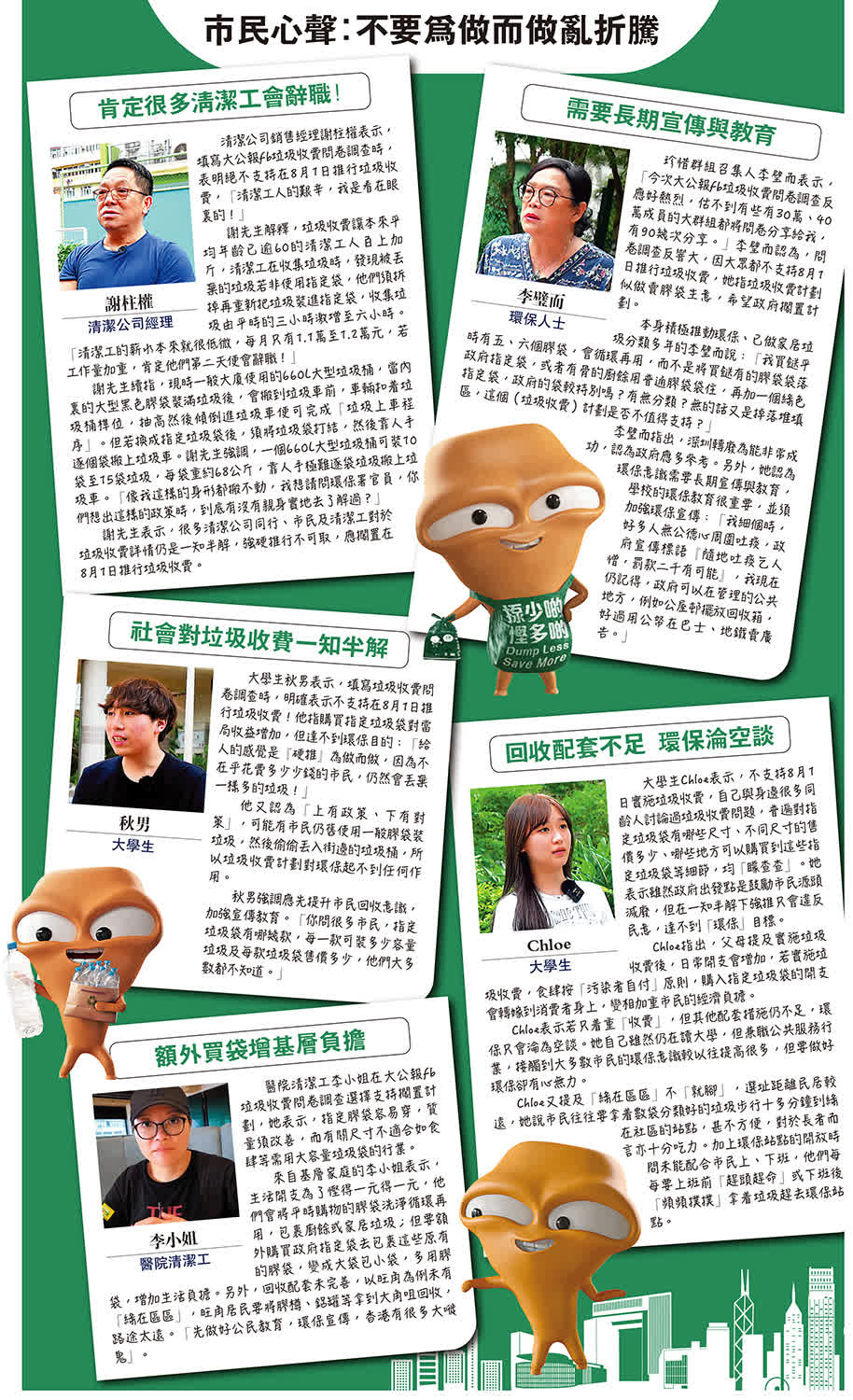 (大公報 記者 李雅雯、李宇俊<文> 鄧浩朗<視頻>)大公報facebook的「垃圾收費」問卷調查反應熱烈,有市民把問卷分享到社交平台多個群組,反映市民非常關注垃圾收費及想表達意見。《大公報》聯絡在留言區發表意見的市民,現身受訪表達不支持8月1日實施垃圾收費的種種原因,包括膠袋商稱指定垃圾袋售價貴、不環保,清潔工指前線工作量倍增、對基層增加生活負擔,大學生認為先做好宣傳教育,提升市民回收意識,達到源頭減廢。