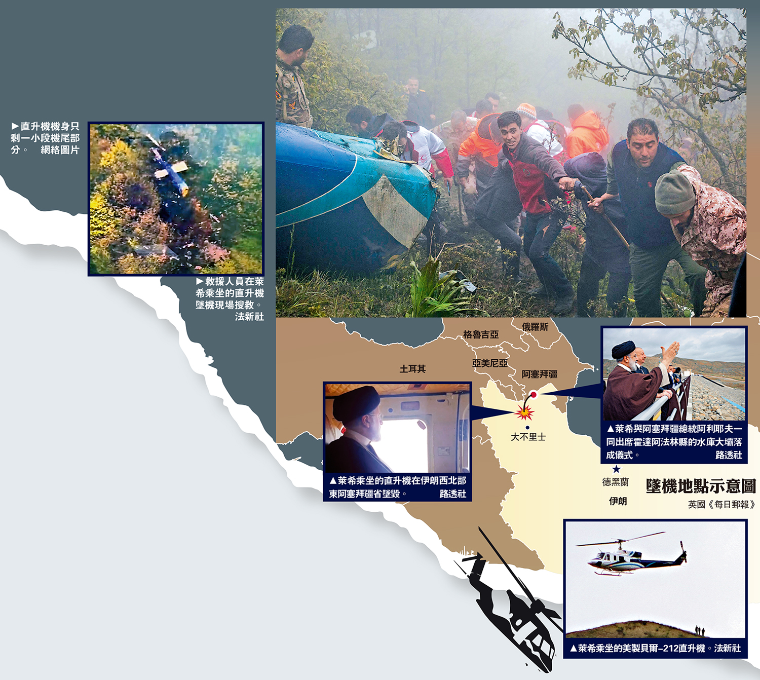 •萊希19日乘坐美製貝爾-212直升機前往阿塞拜疆,為兩國在阿拉斯河合作興建的第三座水壩揭幕。直升機隊回程飛至伊朗東阿塞拜疆省瓦爾扎甘地區上空時,萊希乘坐的直升機因惡劣天氣和大霧,在山區「硬着陸」。