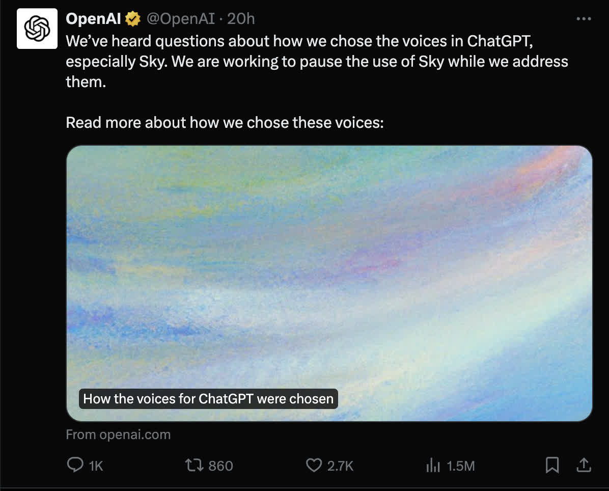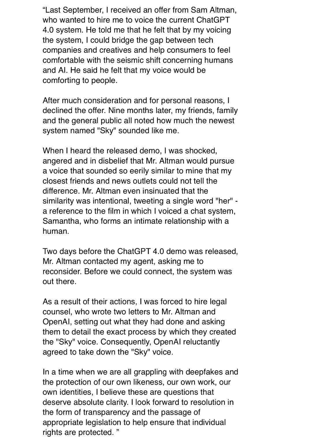 在回應置評媒體請求時,奧特曼發言人在一份書面聲明中表示,「Sky的聲音不是斯嘉麗·約翰遜的,也從來沒有打算與她的聲音相似,」他說,「在與約翰遜女士進行任何接觸之前,我們就選擇了Sky的配音演員。出於對約翰遜女士的尊重,我們已暫停在我們的產品中使用Sky的聲音。對於我們沒有更好地溝通,我們向約翰遜女士表示歉意。 」