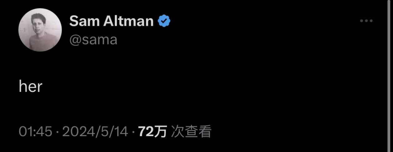 值得注意的是,在發布會的當天,薩姆·奧特曼在社交媒體上發文「her」。斯嘉麗·約翰遜曾用聲音出演了一部知名科幻電影《她》(her)。《她》講述了在不遠的未來,人類與人工智能相愛的科幻愛情電影。男主角在離婚後,接觸到最新的人工智能系統OS1,名為薩曼莎。薩曼莎擁有迷人的聲線,溫柔體貼而又幽默風趣,逐漸讓男主角沉淪。在電影中,薩曼莎則是由斯嘉麗·約翰遜聲音出演。