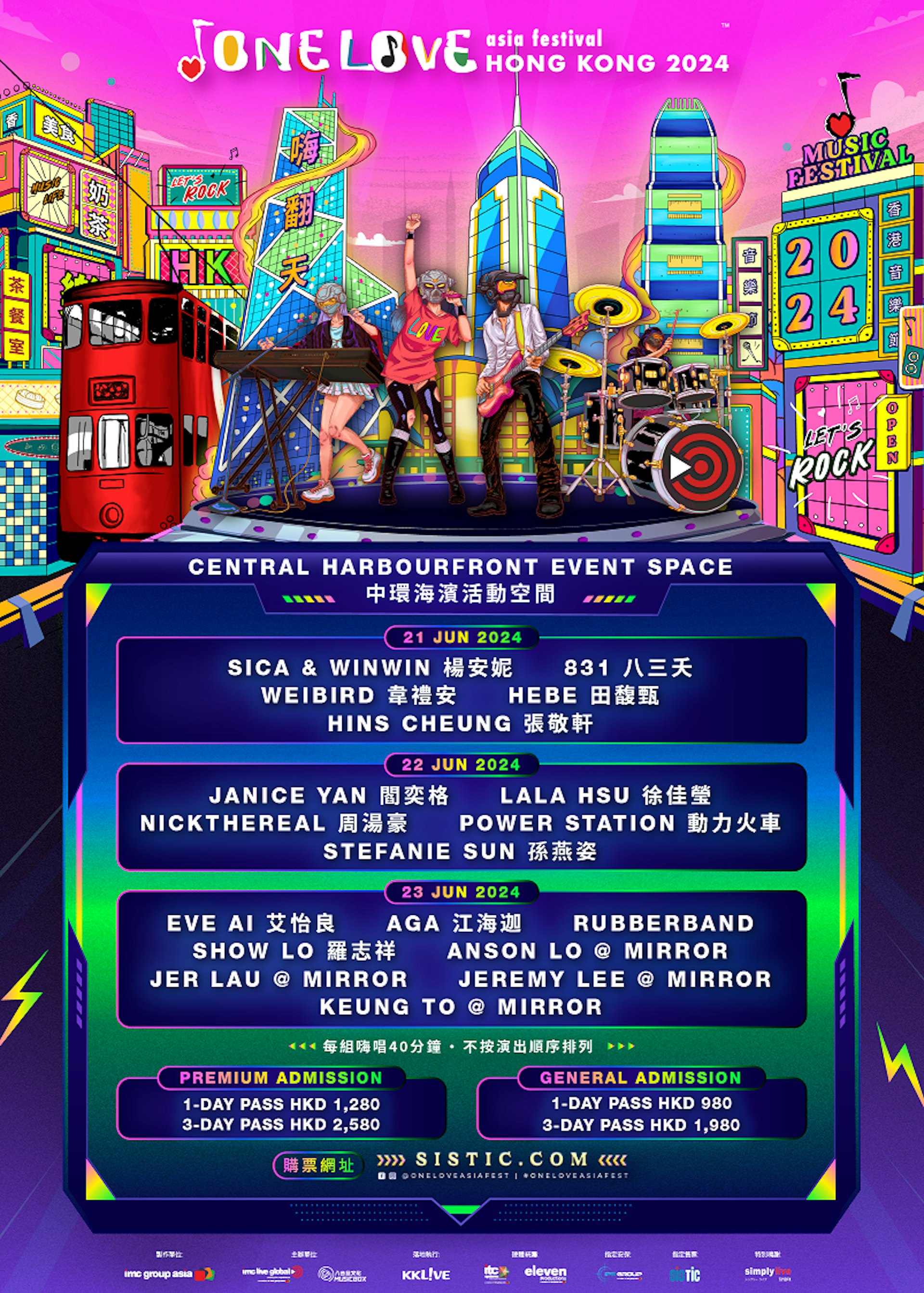 One Love Asia Festival音樂節首次來港。張敬軒、Mirror成員包括姜濤、Anson Lo、Jer、Jeremy以及金曲天后孫燕姿等15組本地及台灣歌手將於6月21至23日,在中環海濱帶來精彩演出。