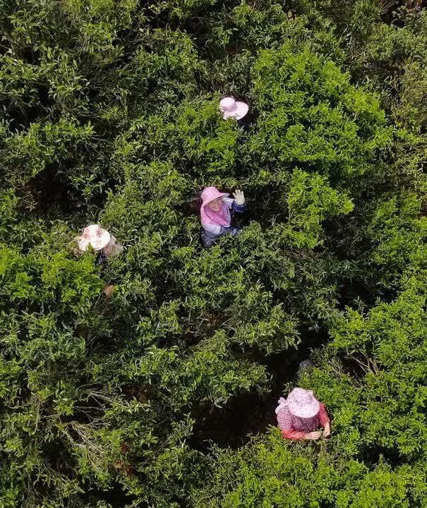 行走在路上,不時就有兩邊掛着竹筐的摩托車從身邊疾馳而過;從外地過來的採茶工在茂密的茶園裏若隱若現,只有站在梯子上時,才露出忙碌的身影。