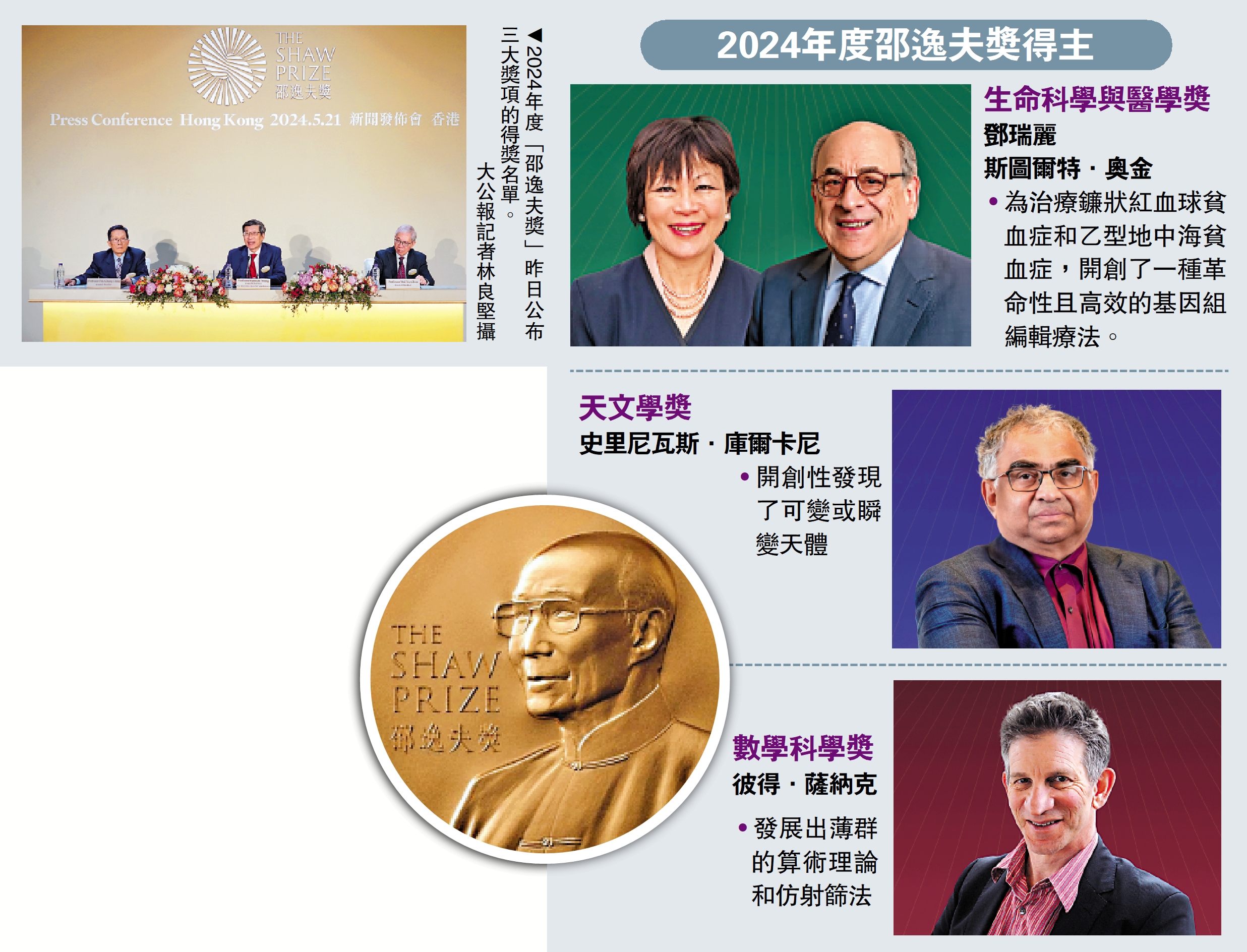 (大公報 實習記者 汪澤妍)2024年度「邵逸夫獎」獲獎名單出爐,今屆有四位學者上榜。當中,生命科學與醫學獎平均頒予美國的鄧瑞麗及斯圖爾特·奧金;天文學獎頒予美國的史里尼瓦斯·庫爾卡尼;而數學科學獎頒予美國的彼得·薩納克。