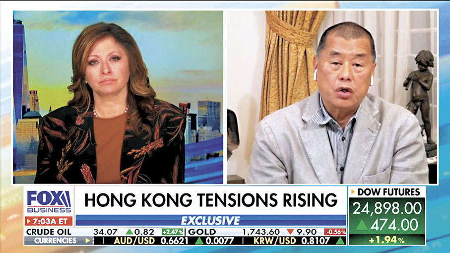 《金融時報 (Financial Times)》於2020年8月12日發布的訪問片段,節錄了黎智英在同年4月24日的受訪內容。黎智英在受訪時提到對香港國安法的看法,稱令他自己安全的唯一方法、或是減緩「他們」「接管」香港,就是國際力量的支持,尤其是美國政府的支持,又稱這是「現在我們唯一的救命方法」。