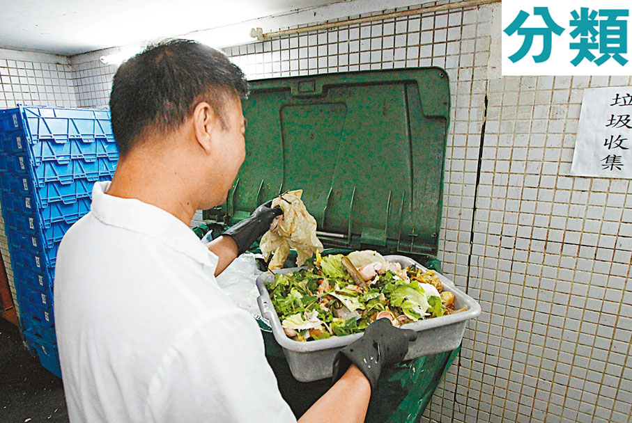 到底「先行先試」計劃具體落實情況是怎樣?香港文匯報記者日前到大埔一間作為試點的酒樓直擊具體操作情況。在廚房、洗碗間及垃圾收集處,只見員工來來往往推送顧客用過的餐具及廚餘,現場設有分類回收設施,分別收集鐵罐、普通垃圾及廚餘,相關垃圾桶套着大號的指定垃圾袋,廚餘收集區則放置兩個垃圾桶,各套上一個非指定的垃圾袋。