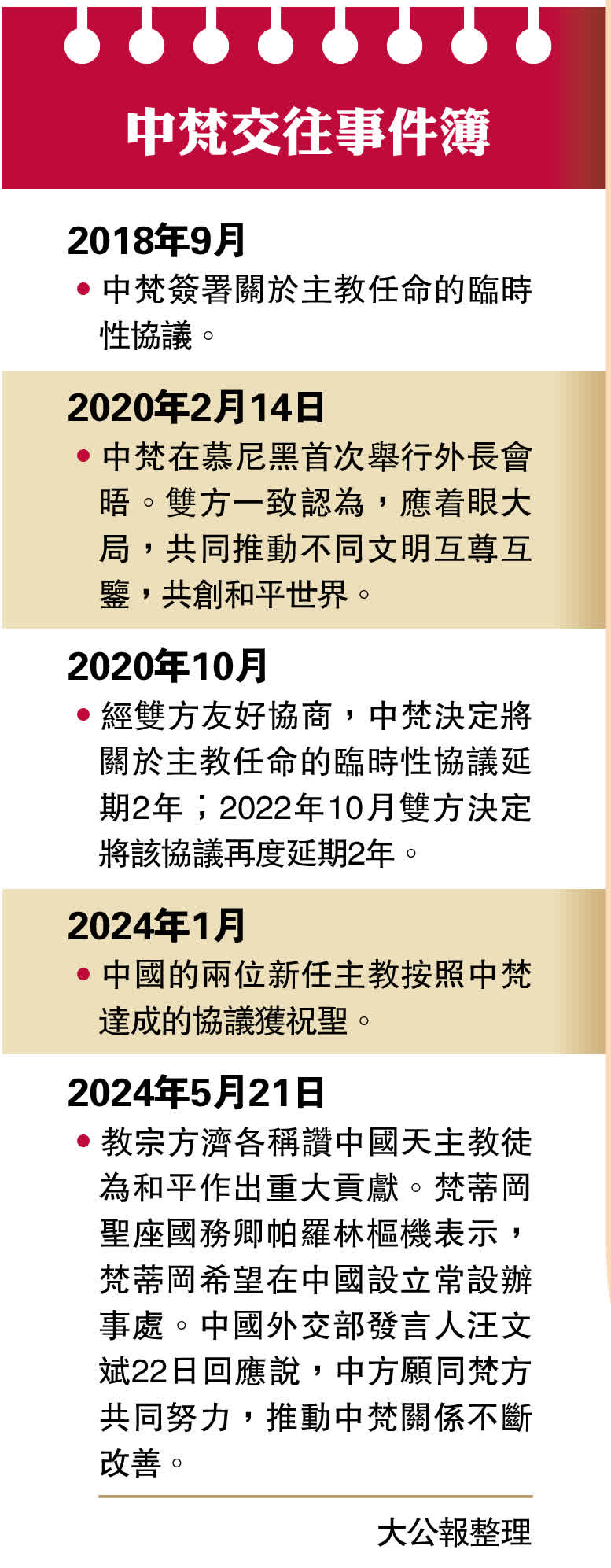 2018年9月,中梵簽署關於主教任命的臨時性協議。2020年10月,經雙方友好協商,中梵決定將關於主教任命的臨時性協議延期2年;2022年10月雙方決定將該協議再度延期2年。