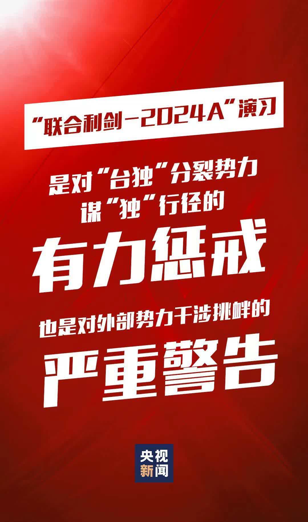 5月23日至24日,中國人民解放軍東部戰區組織戰區陸軍、海軍、空軍、火箭軍等兵力,位台島周邊開展「聯合利劍-2024A」演習,重點演練聯合海空戰備警巡、聯合奪取戰場綜合控制權、聯合精打要害目標等科目,艦機抵近台島周邊戰巡,島鏈內外一體聯動,檢驗戰區部隊聯合作戰實戰能力。這是中國維護國家主權和領土完整的正義之舉,也是對「台獨」分裂勢力謀「獨」行徑的有力懲戒,對外部勢力干涉挑釁的嚴重警告。