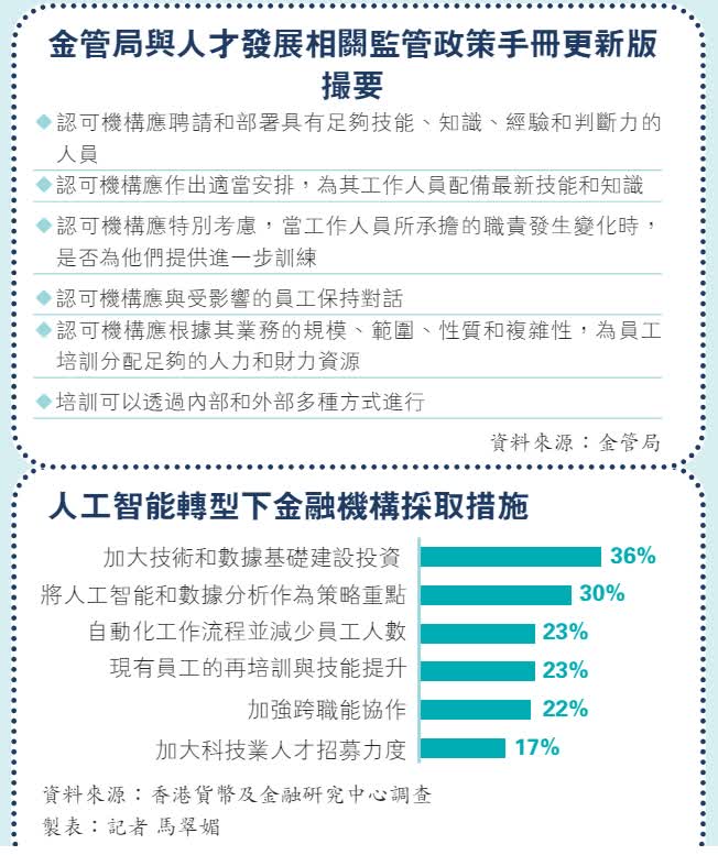 金管局昨發布一份與人才發展相關的監管政策手冊的更新版,其中列明認可機構可考慮為相關人員提供具針對性的結構化訓練,如香港銀行學會、財資市場公會亦有提供一系列培訓課程。而對人工智能時代來勢洶洶下,銀行業人力資源管理出現變化,金管局副總裁阮國恒昨在《匯思》撰文提到,為應對未來轉變,銀行業界必須及早部署,在人力資源管理方面做好規劃,才可為銀行員工、客戶及銀行本身帶來「三贏」的局面。