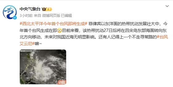 據中央氣象台消息,菲律賓以東洋面的熱帶擾動發展壯大中,今年首個颱風生成在即。目前來看,該熱帶擾動27日後將在呂宋島東部海面轉向東北方向移動,未來對我國近海無明顯影響。