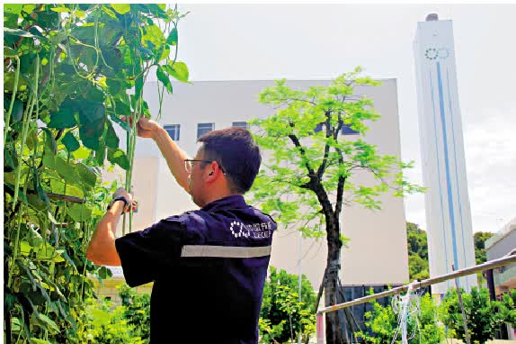 採菊東籬下,悠然見南山。在發電廠高聳的煙囱旁,一排籬笆上纏滿綠藤,青豇豆、紫茄子、小西紅柿,長得十分可愛。田裏還有小葱、韭菜、草莓,讓人幾乎忘掉這裏是個垃圾焚燒發電廠。