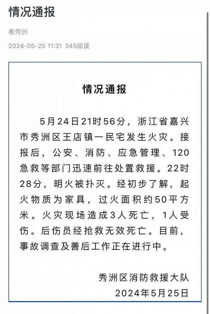 據浙江嘉興市秀洲區消防通報消息,5月24日21時56分,浙江省嘉興市秀洲區王店鎮一民宅發生火災。接報後,公安、消防、應急管理、120急救等部門迅速前往處置救援。22時28分,明火被撲滅。經初步了解,起火物質為傢具,過火面積約50平方米。火災現場造成3人死亡,1人受傷。傷員經搶救無效死亡。目前,事故調查及善後工作正在進行中。