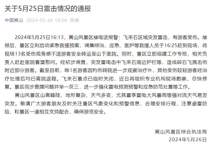 大公文匯網報道,昨日(25日),多名遊客反映安徽黃山景區內發生雷擊致多人受傷事件引關注。今日(26日),黃山風景區綜合執法局發布通報稱,經初步調查,突發雷電擊中飛來石周邊護欄等,造成碎石飛濺擊傷附近部分遊客。