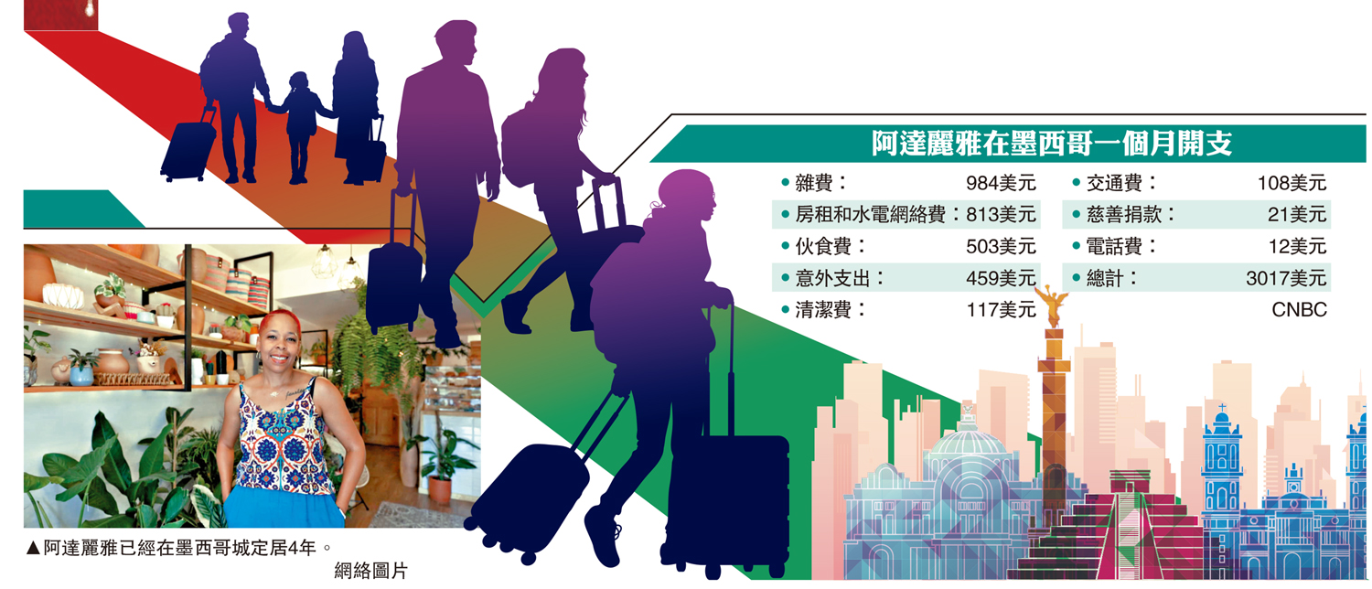 現年49歲的阿達麗雅表示,自己想要生活在一個適合步行、公共交通發達、擁有國際機場的城市,而墨西哥城很符合她的標準。她開設了自己的網站和YouTube頻道,為用戶提供個性化理財、搬家信息等多種服務,去年收入為3.8萬美元,但她每周只需要工作15個小時左右。