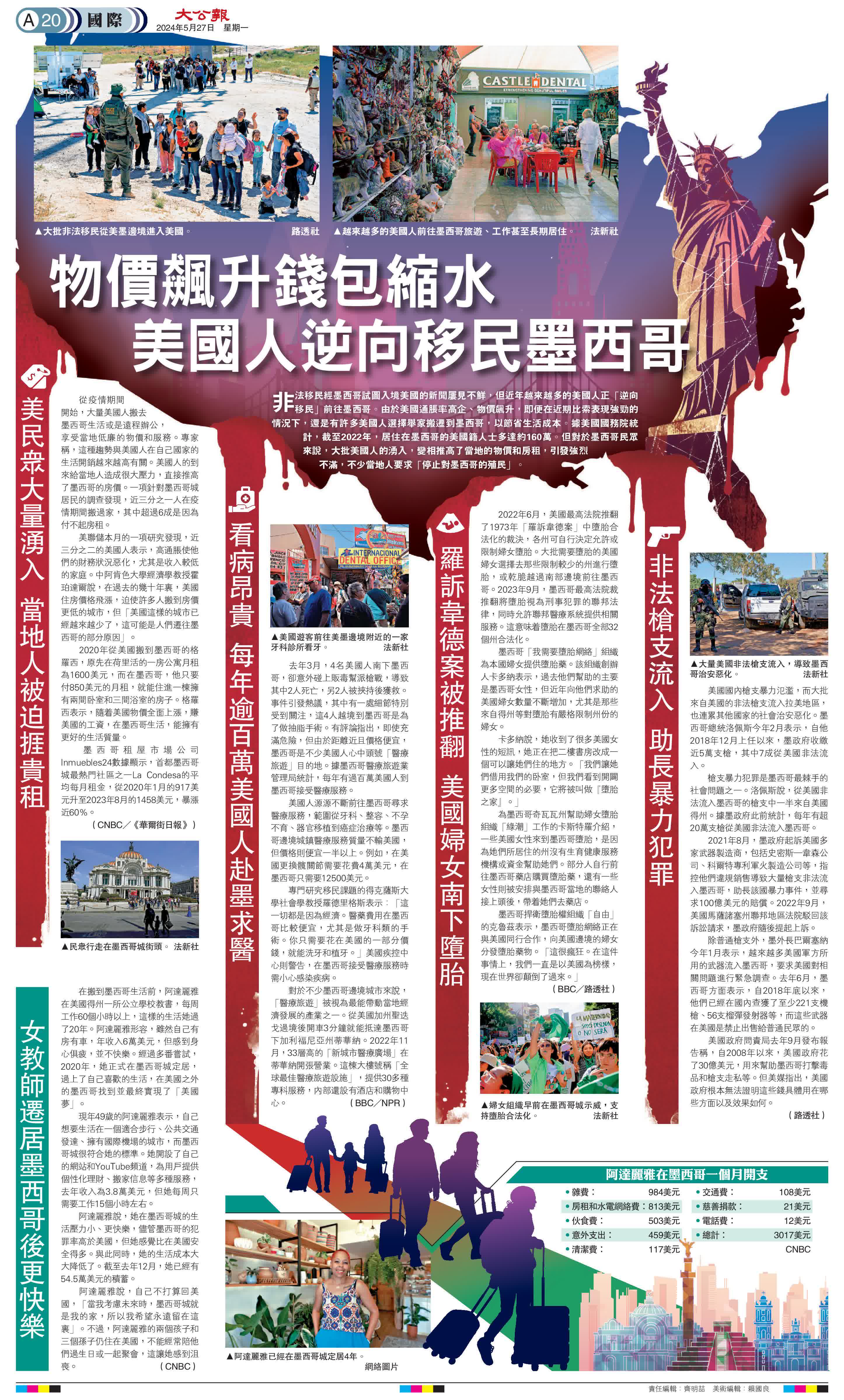 大公報綜合路透社、CNBC、《華爾街日報》、BBC、法新社報道,非法移民經墨西哥試圖入境美國的新聞屢見不鮮,但近年越來越多的美國人正「逆向移民」前往墨西哥。由於美國通脹率高企、物價飆升,即便在近期比索表現強勁的情況下,還是有許多美國人選擇舉家搬遷到墨西哥,以節省生活成本。據美國國務院統計,截至2022年,居住在墨西哥的美國籍人士多達約160萬。但對於墨西哥民眾來說,大批美國人的湧入,變相推高了當地的物價和房租,引發強烈不滿,不少當地人要求「停止對墨西哥的殖民」。