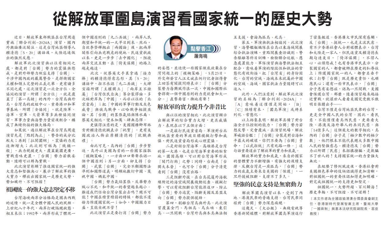 這幾天,《大公報》、無綫電視等香港新聞媒體,對解放軍圍島軍演進行了密集報道。香港廣大市民深有感觸,反「台獨」、挺統一,也是主流民意。有不少香港社會人士對媒體表示,台灣和大陸是一家人,但民進黨及賴清德長期勾連美日,「倚洋謀獨」,不得人心,必須懲戒!也有香港市民表示,分裂國家的人,都會被綁在歷史的恥辱柱上;維護國家統一的人,都會名垂千秋;打擊「台獨」既是歷史責任,也順應民心;還有一些市民表示,「台獨」分子患有妄想症,認為一旦開戰,美國會保護台灣。那麼,隨着演習越來越接近實戰,就讓世人看看美國究竟敢不敢明目張膽出手……