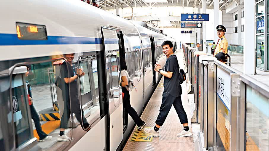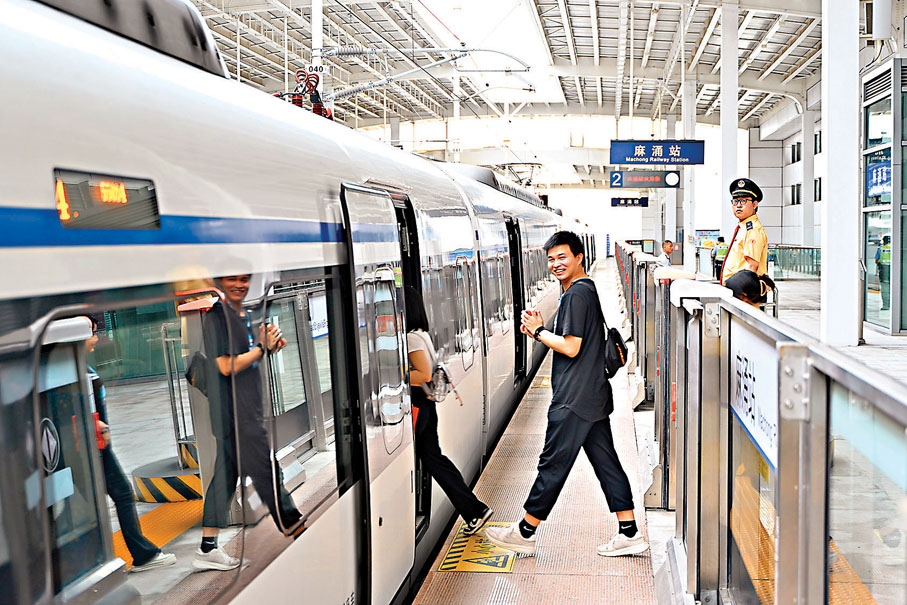 (香港文匯報 記者 方俊明、聶曉輝 廣州報道)粵港澳大灣區城際交通網進一步拓展,廣佛南環、佛莞城際鐵路於昨日正式投入運營,與已運營的莞惠、佛肇城際串聯貫通,在大灣區形成一條東西走向、全長258公里的交通大動脈,連接惠州、東莞、廣州、佛山、肇慶五市。同時,該城際鐵路全面啟用「站站停+大站快車」運營模式,被譽為目前灣區「最長地鐵」,亦成為全國「最長跨市地鐵」。港人持八達通與全國交通一卡通或嶺南通其中一張聯名,即可拍卡入站,車來即走,無須提前購票。目前南珠(中)城際正加快建設,規劃與深南中城際等貫通運行,當灣區城際網成形,廣州地鐵將直達深圳市中心並經深港口岸銜接香港,便捷「1小時通勤圈」。