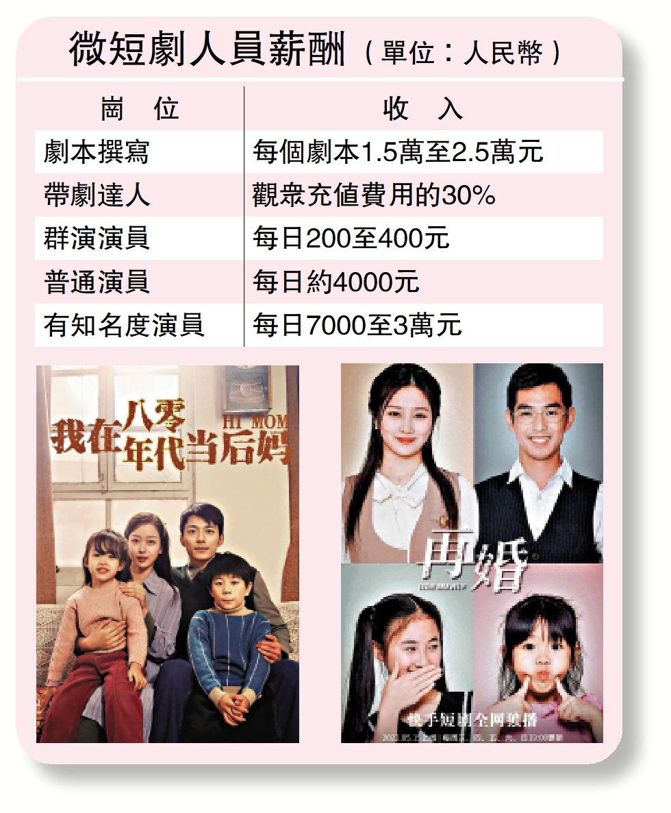 受益的還有一大批「橫漂」演員,曾經在大劇組裏的特約演員,甚至站前景的群演,都能在微短劇裏找到更多戲分,有些甚至還當上主角,收入翻倍增加。有拍攝經驗、形象氣質好的群演片酬,已從每天200元提高到每天300至400元,普通演員一天約4000元,在微短劇中稍露頭角或有一定知名度的演員,片酬每日更可達到7000元至3萬元。