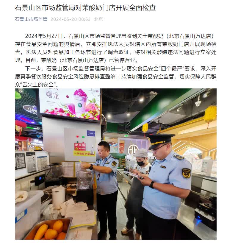 北京市石景山區市場監管局表示,執法人員對食品加工各環節進行了調查取證,將對相關涉嫌違法問題進行立案處理。目前茉酸奶(北京石景山萬達店)已暫停營業。