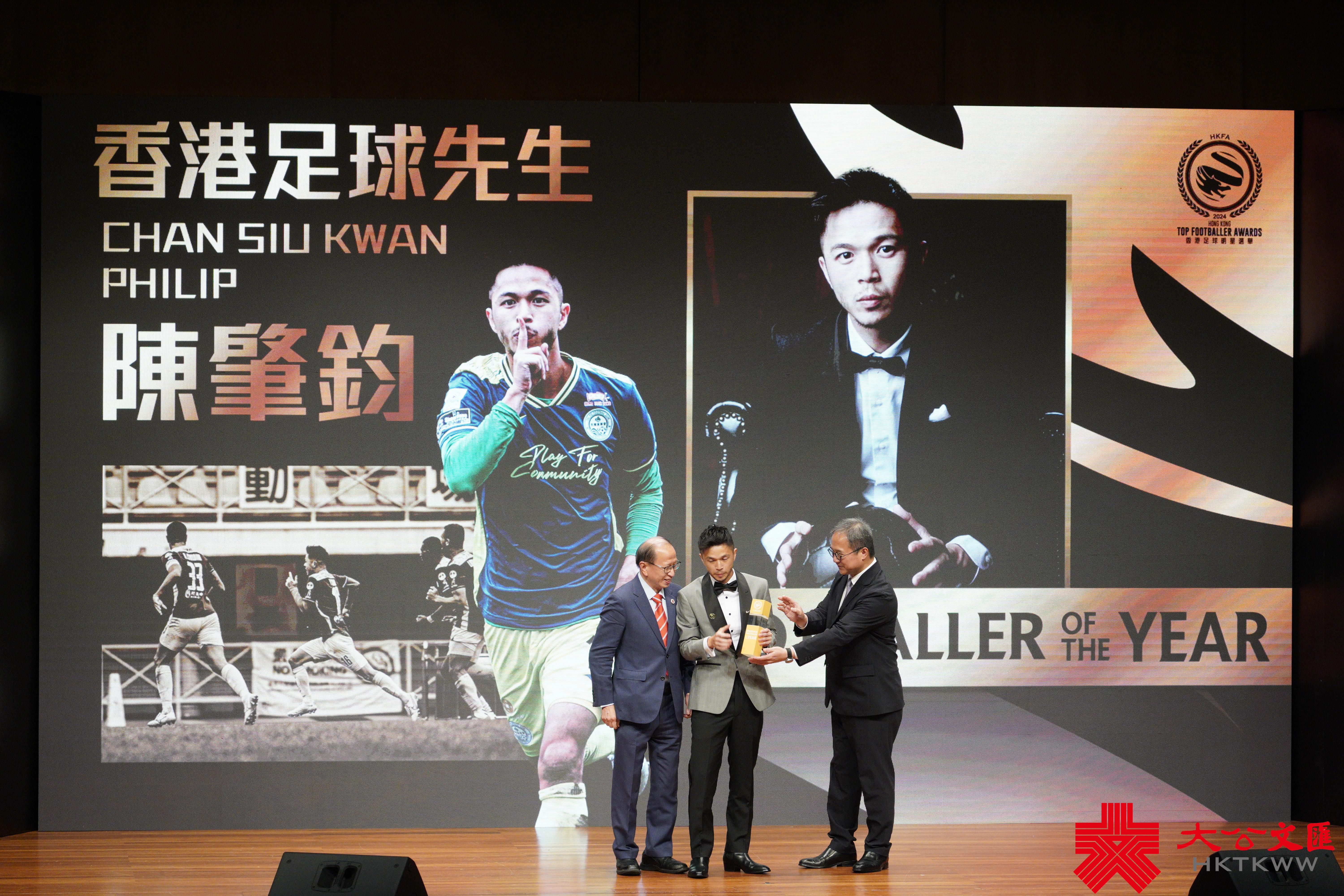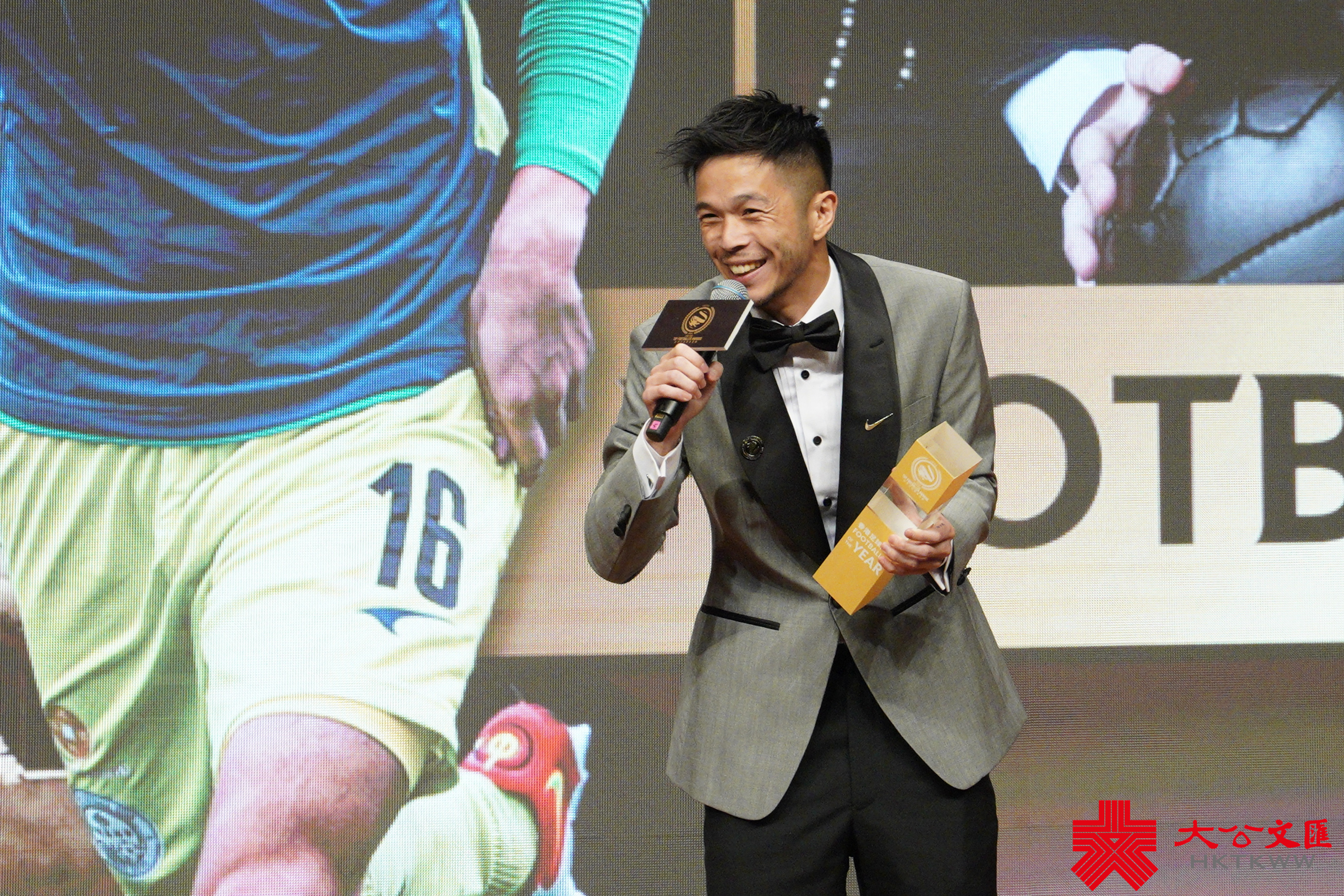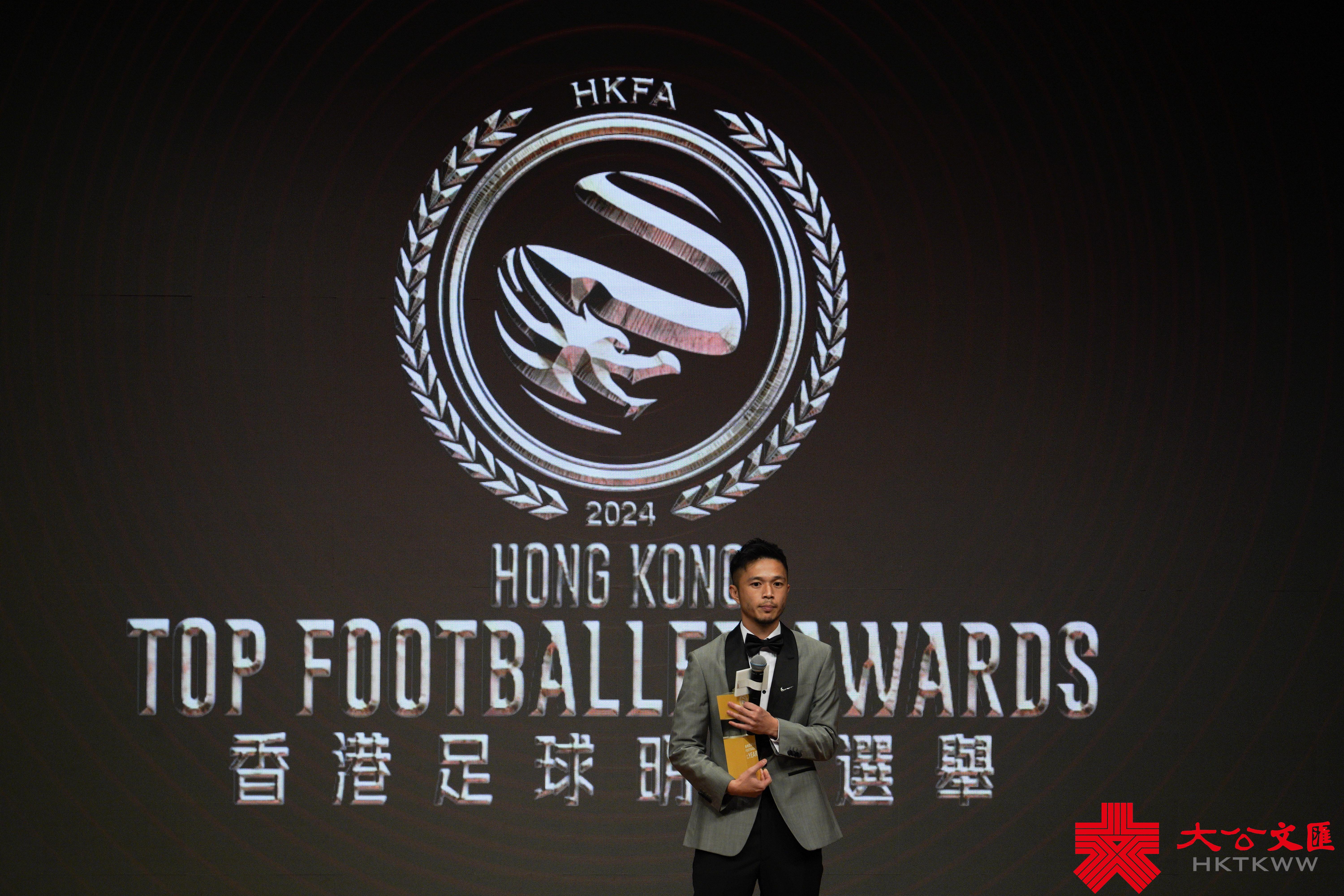 大公文匯全媒體報道,2023/24季度香港足球明星選舉今晚(28日)在會展頒獎,效力大埔的港隊中場陳肇鈞當選香港足球先生,是繼2016年葉鴻輝之後、相隔8年再有港將獲此殊榮。另外,陳肇鈞更連奪港超聯最佳港隊球員、最受球迷歡迎球星及足球明星11人,包攬四大獎項,成為當晚最大贏家。
