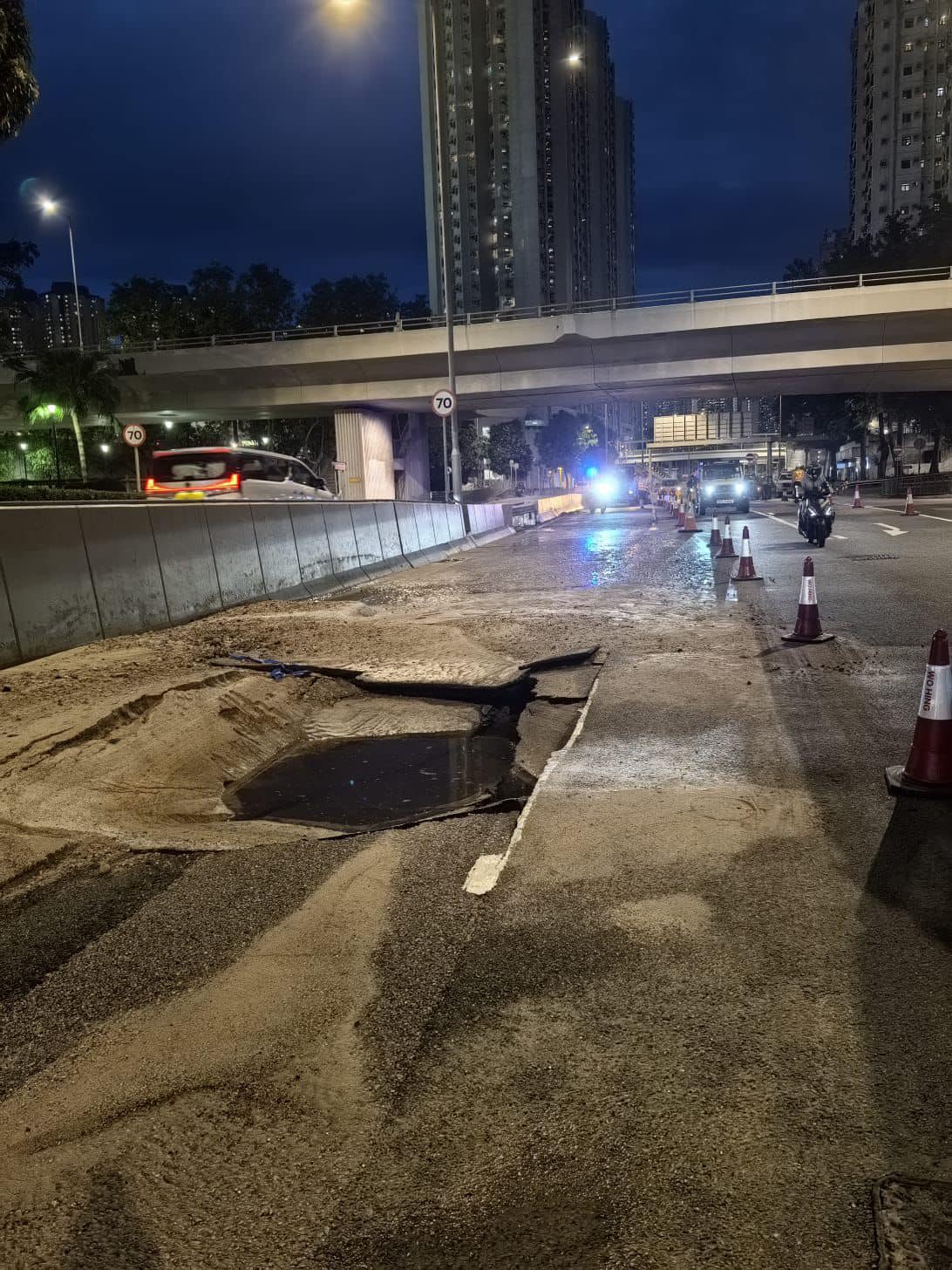 南區區議員張偉楠在社交平台表示,事發地點因地下鹹水管爆裂引致路面下陷,部分行車線需封閉以進行搶修工程,預計會對明早繁忙時間交通造成相當程度影響。他呼籲需途經上址居民預早規劃行程,駕駛人士請遵照現場警員或臨時交通標誌指示,小心駕駛。