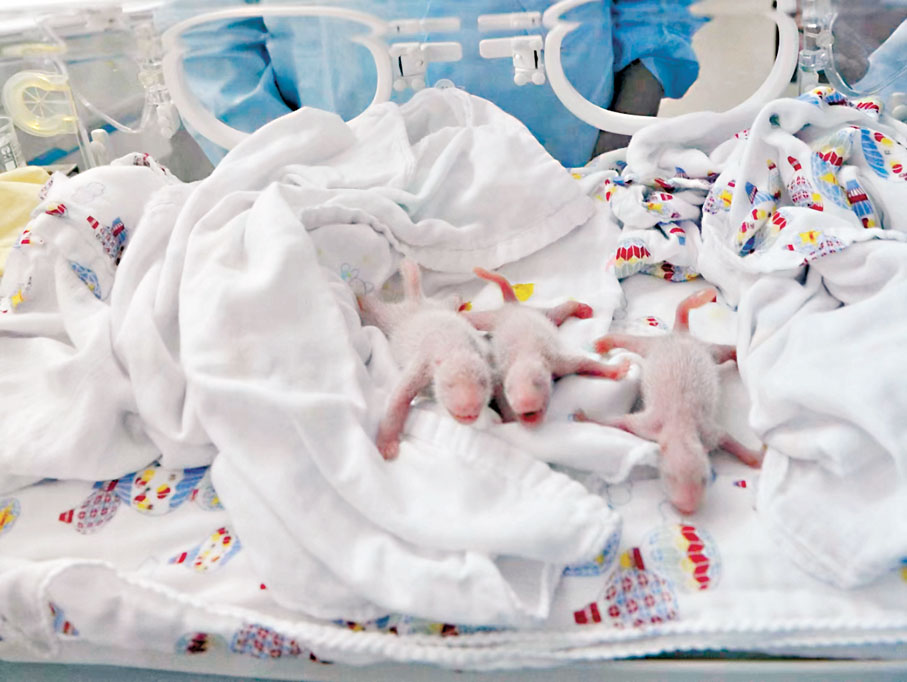 凌晨4點多,三弟酷酷出生,牠比前兩隻都要大,也顯得更有活力,菊笑馬上把萌萌扔到地上,把酷酷抱到懷裏。「連續生產耗盡了菊笑的體力,為了讓牠休息,我們將三個幼崽都拿到育嬰箱裏。一直到給幼崽餵上初乳前,我們都保持着高度緊張。」