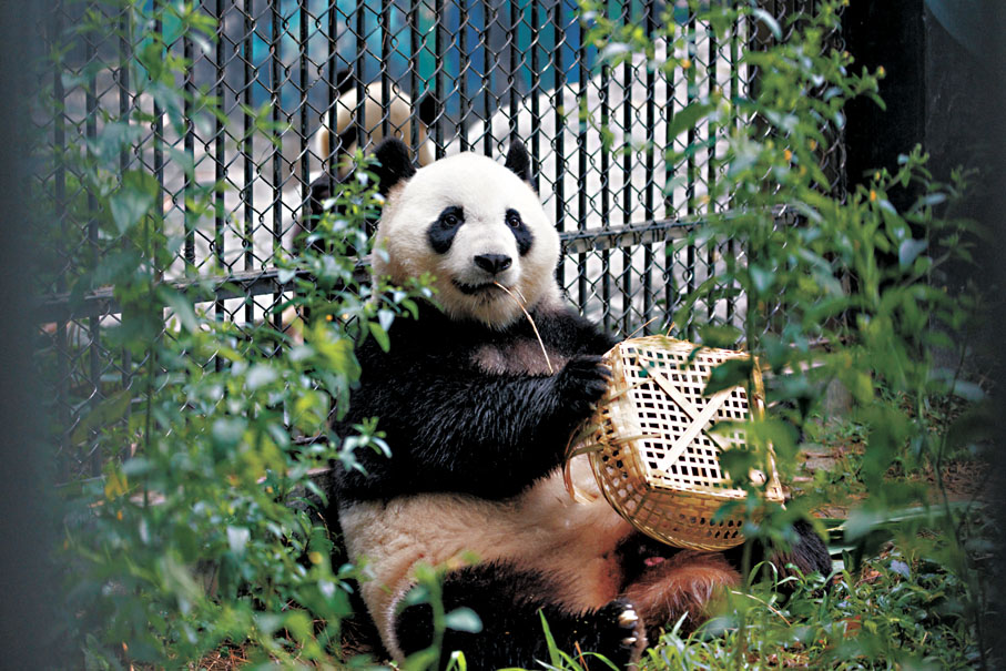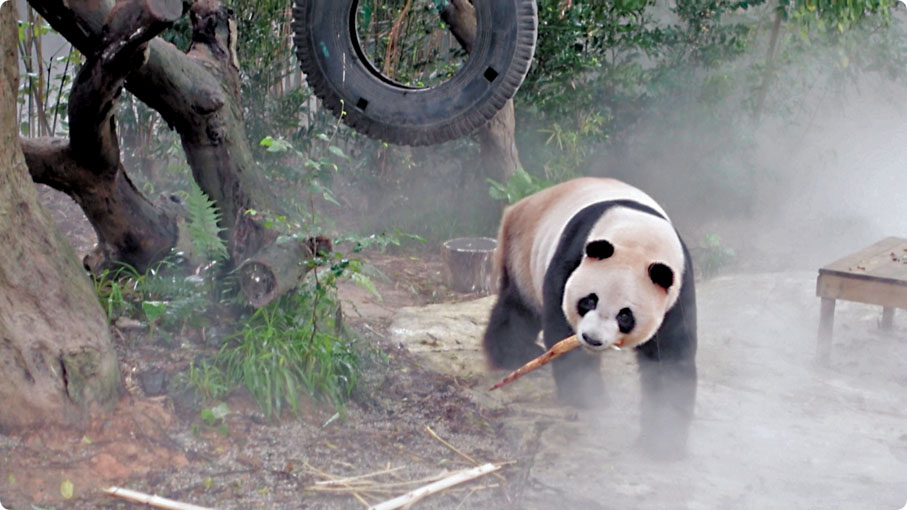 兩隻熊貓都很貪玩,但珍大要更活潑一點,牠最喜歡吊床,總在吊床上面睡覺,還會在吊床上翹着小腳腳晃來晃去,彷彿哄自己睡覺的小寶寶。此外,珍大還喜歡風火輪,常常將滾輪套在自己身上沿着內場狂飆一圈,活潑極了,雖然已經是中年熊,但貪玩勁兒卻還非常充足。「雙兒更喜歡麻袋和球,我們在麻袋裏裝竹筒和稻草給牠玩,牠總是聞了又聞,嗅了又嗅,非常感興趣,還會把漏食球抱起來嘩啦嘩啦響。」