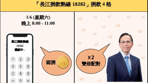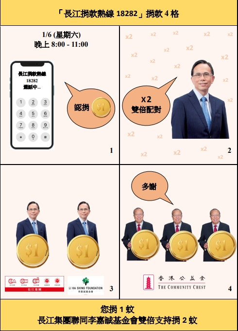 大公文匯全媒體報道,本周六 (6月1日),長江集團聯同李嘉誠基金會將再度為「公益金及時醫療援助基金」籌款。當晚8時至11時,無綫電視翡翠台播放「萬眾同心公益金」電視籌款節目期間,公眾致電長江捐款熱線「18282」每認捐1元,長江集團聯同李嘉誠基金會將雙倍支持,配對捐款2元。「公益金及時醫療援助基金」將分階段為公營醫療未能涵蓋的特定病患者提供醫療支援。