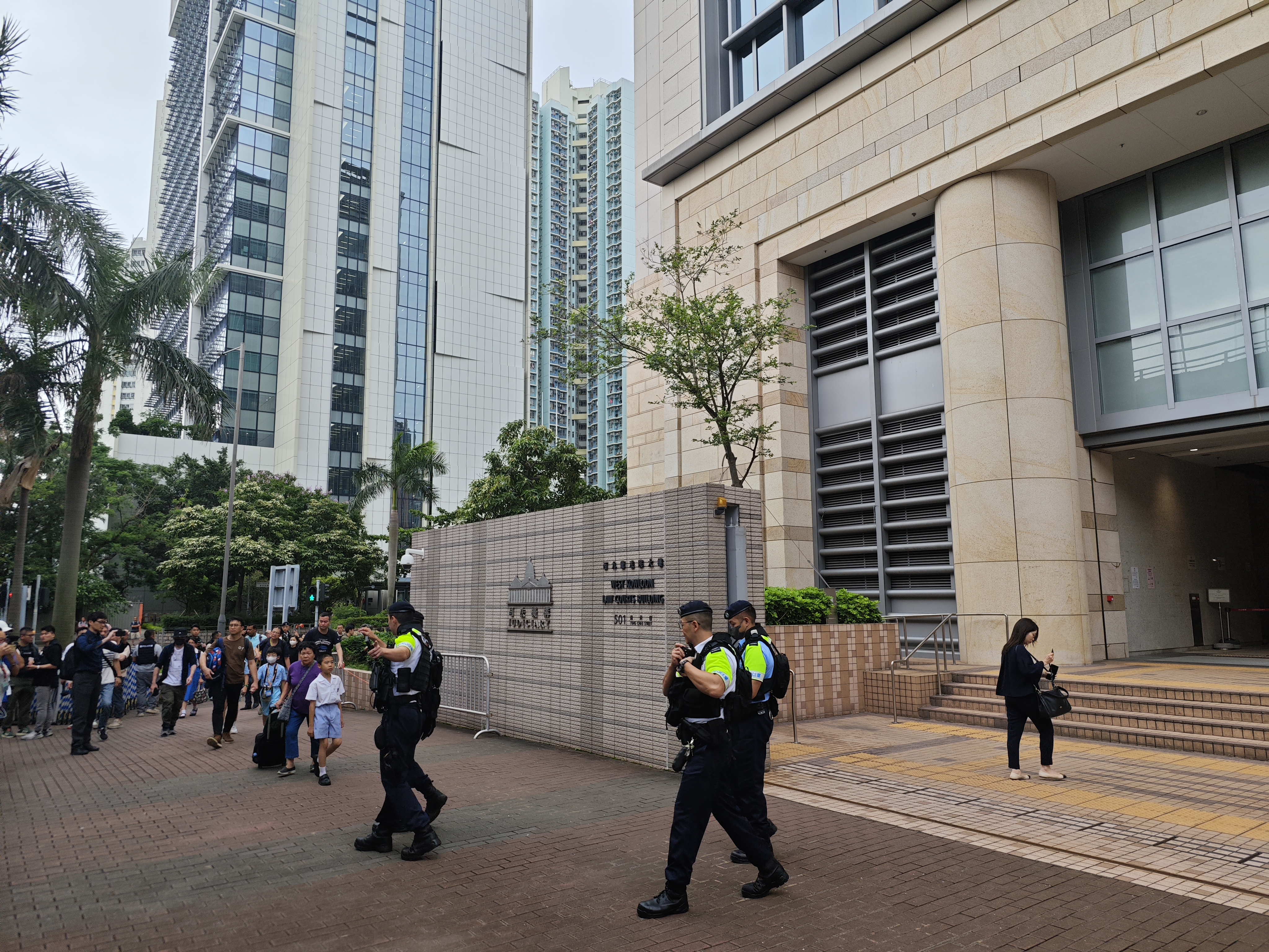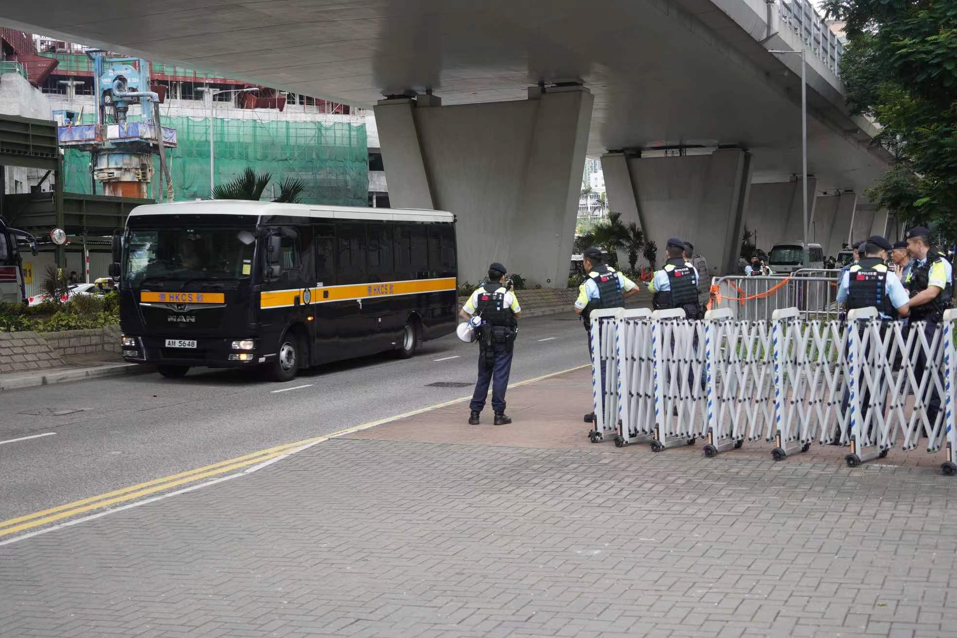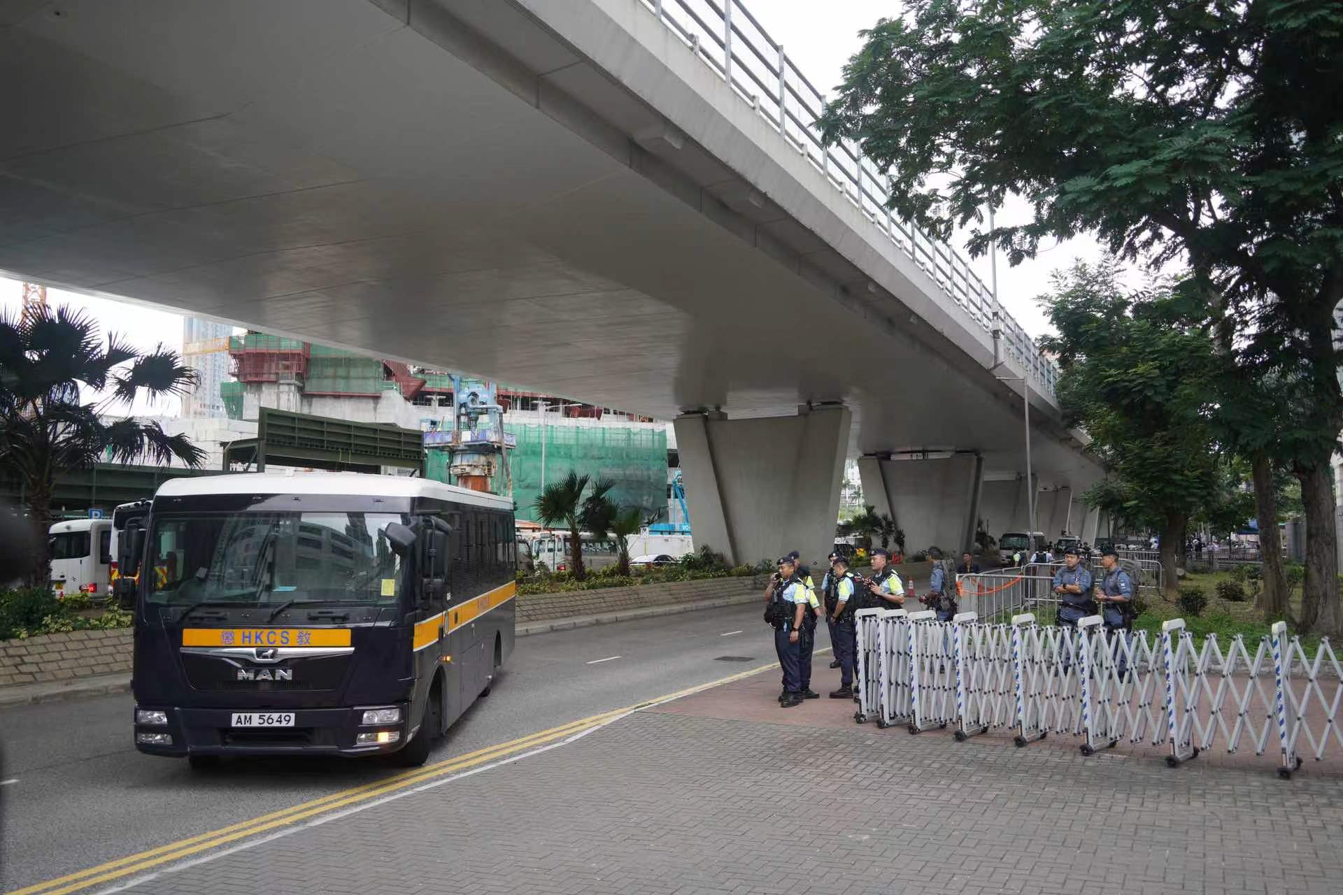 今早,西九龍法院大樓周圍加強安保,警方出動裝甲車,數名警方人員在現場巡邏。約7時36分,載有被告的第一輛囚車駛入法院大樓;第二輛囚車在約8時7分進入法院大樓;第三輛囚車在約8時12分抵達;第四輛囚車約8時16分到場;第五輛囚車約8時17分進入法院大樓;第六輛囚車約8時22分進入法院大樓;第七輛囚車約8時25分到達。