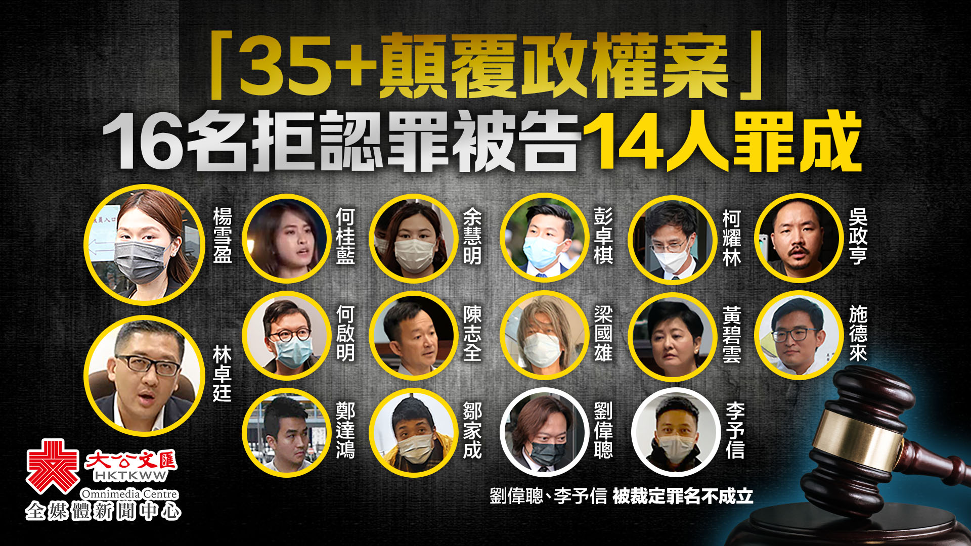 大公文匯全媒體報道,攬炒派47人涉嫌組織及參與「35+非法初選案」,被控干犯香港國安法下的「串謀顛覆國家政權」罪,包括戴耀廷在內的31名被告在審前認罪,餘下16人不認罪受審。高等法院3名國安法指定法官今日(30日)對16名不認罪被告宣布裁決,當中14人被裁定罪名成立,劉偉聰和李予信被裁定罪名不成立。