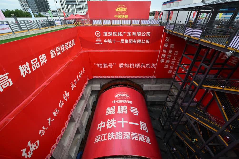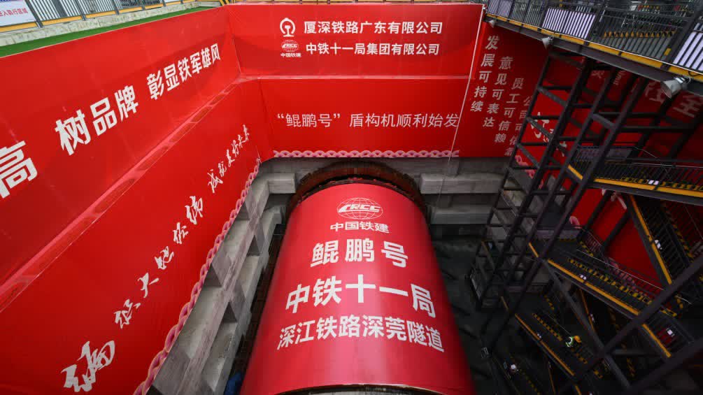 據新華網報道,5月30日,在中鐵十一局深圳至江門高鐵深莞隧道西段施工現場,國內複合地層施工最大直徑土壓平衡盾構機「鯤鵬號」順利始發,標誌着深江高鐵深莞段正式進入盾構施工階段。