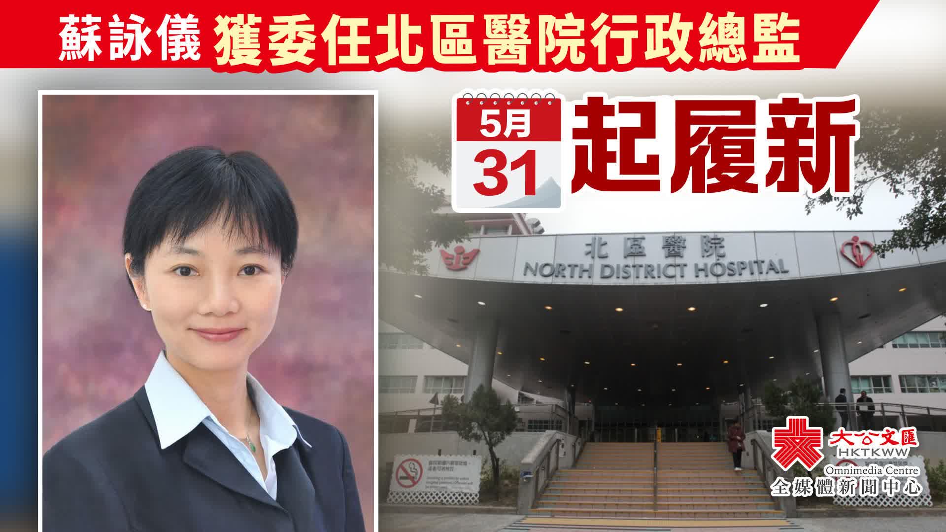 大公文匯全媒體報道,醫管局發言人今日(30日)公布委任高層管理人員,蘇詠儀醫生獲委任為北區醫院行政總監,將於明日(31日)履新。