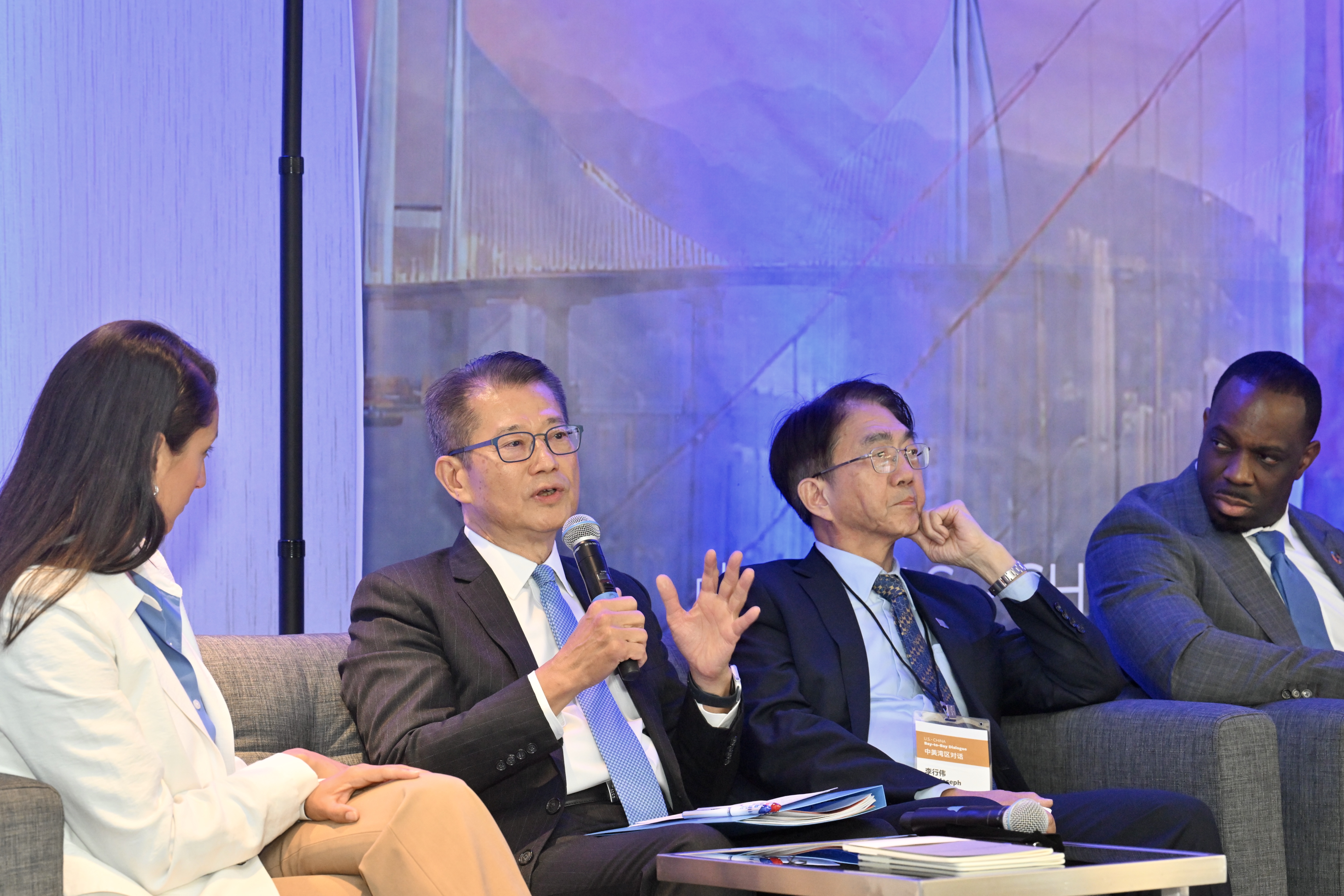 「中美灣區對話」圍繞粵港澳大灣區和三藩市灣區在多方面的合作。陳茂波於早上首場題為「建設綠色低碳灣區:政策與行動」討論環節中發言,分享香港在2050年前達到碳中和的目標,以及邁向這目標期間低碳轉型政策措施,包括利用更清潔的能源發電、以集體運輸尤其是鐵路系統為骨幹的交通和城市建設、建築物節能減排和綠色建築,以及減廢等。他也闡述香港在用好金融中心優勢、促進資金與綠色項目高效對接的工作和進展。
