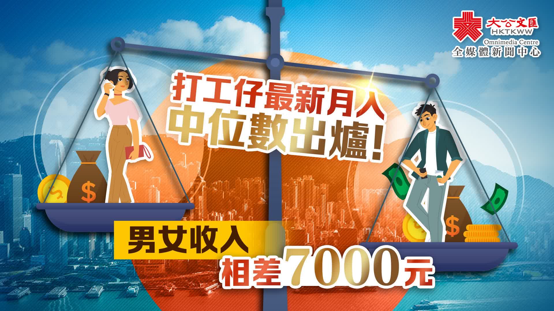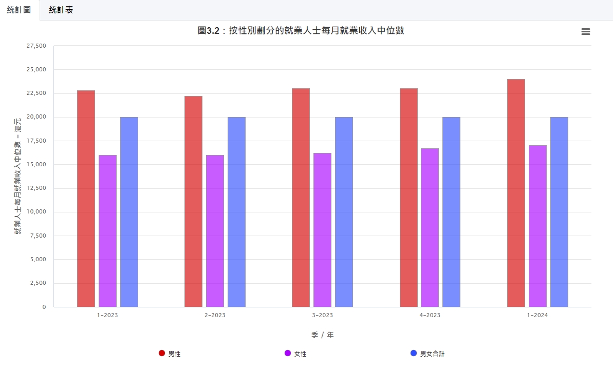 統計報告顯示,今年首季的就業人數為3,688,400人,當中48.9%為男性,51.1%為女性,就業人士每月就業收入中位數為2萬元。而男女月入中位數差距增大,差額由上一季的6300港元,增至今年首季的7000港元。即在職男性的每月就業收入中位數2.4萬元,在職女性為1.7萬元。撇除外籍家庭傭工後,在職女性月入中位數為2萬元,與男性打工仔月薪仍有4000元差距。