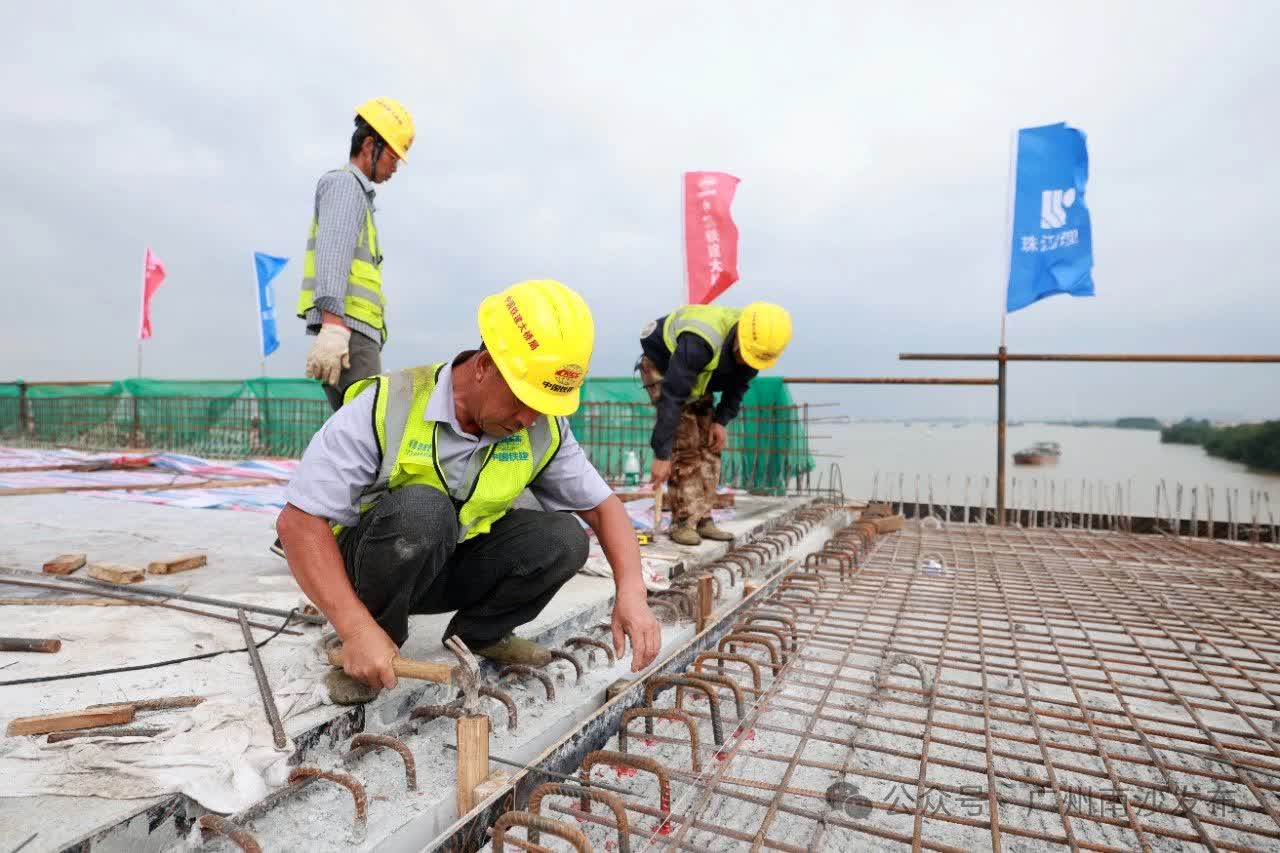 記者在現場看到,瀝心沙大橋架梁施工已完成,工人正在進行橋面系的鋼筋綁紮和混凝土澆築工作,還有部分工人在對護欄進行塗裝,江面上依然停靠着大型工程船在進行作業。