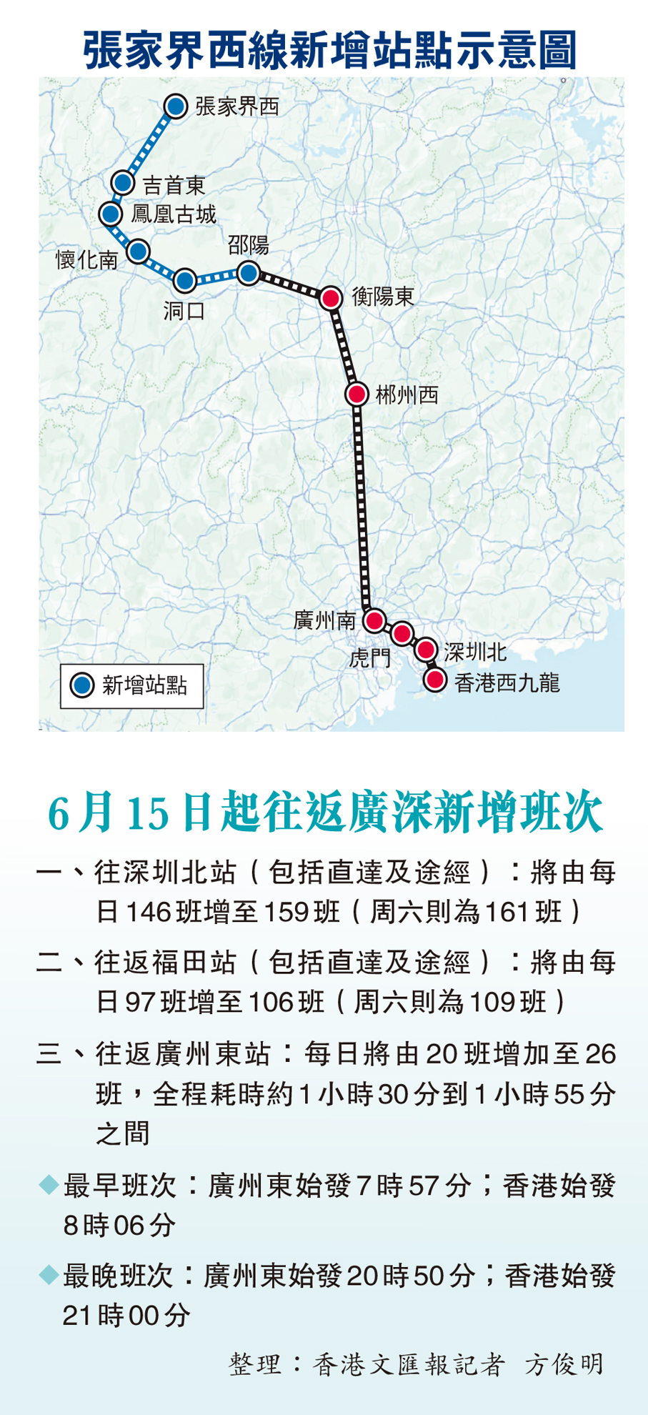 港鐵有限公司(港鐵)30日宣布,廣深港高鐵香港段將進一步增加站點、提升服務。自6月15日起,港鐵將增設一條往返湖南省的長途線路,途中新增6個站點,開通後乘客可從香港直達張家界、鳳凰古城等多個旅遊名勝。除了一個因線路調整不再經停的站點,屆時從香港西九龍站出發列車的直達站點可由目前的73個增加至78個。