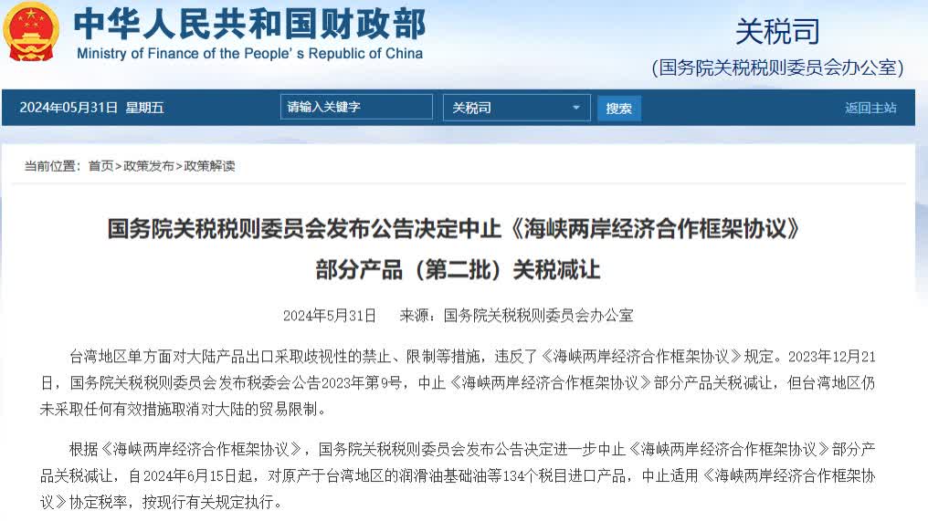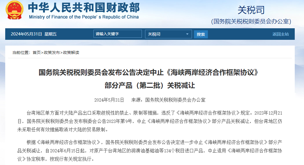 自2024年6月15日起,對原產於台灣地區的附件所列潤滑油基礎油等134個稅目進口產品,中止適用《海峽兩岸經濟合作框架協議》協定稅率,按現行有關規定執行。