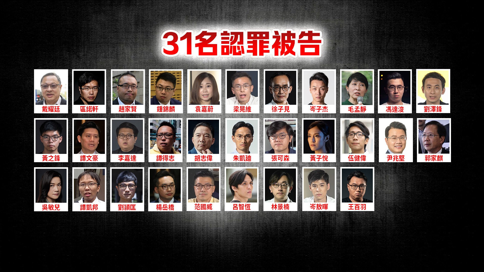 31名被告在審前認罪,包括首被告戴耀廷、區諾軒、黃之鋒、譚文豪、毛孟靜、胡志偉、朱凱廸、譚得志、范國威、郭家麒、劉頴匡、楊岳橋、岑敖暉、林景楠、伍健偉、鍾錦麟、趙家賢、梁晃維、徐子見、岑子杰、劉澤鋒、李嘉達、張可森、黃子悅、尹兆堅、譚凱邦、王百羽、袁嘉蔚、馮達浚、吳敏兒、及呂智恆。其中伍健偉和林景楠原表示擬不認罪,但分別於去年11月的案件管理聆訊,及上月的審前審核改為認罪。