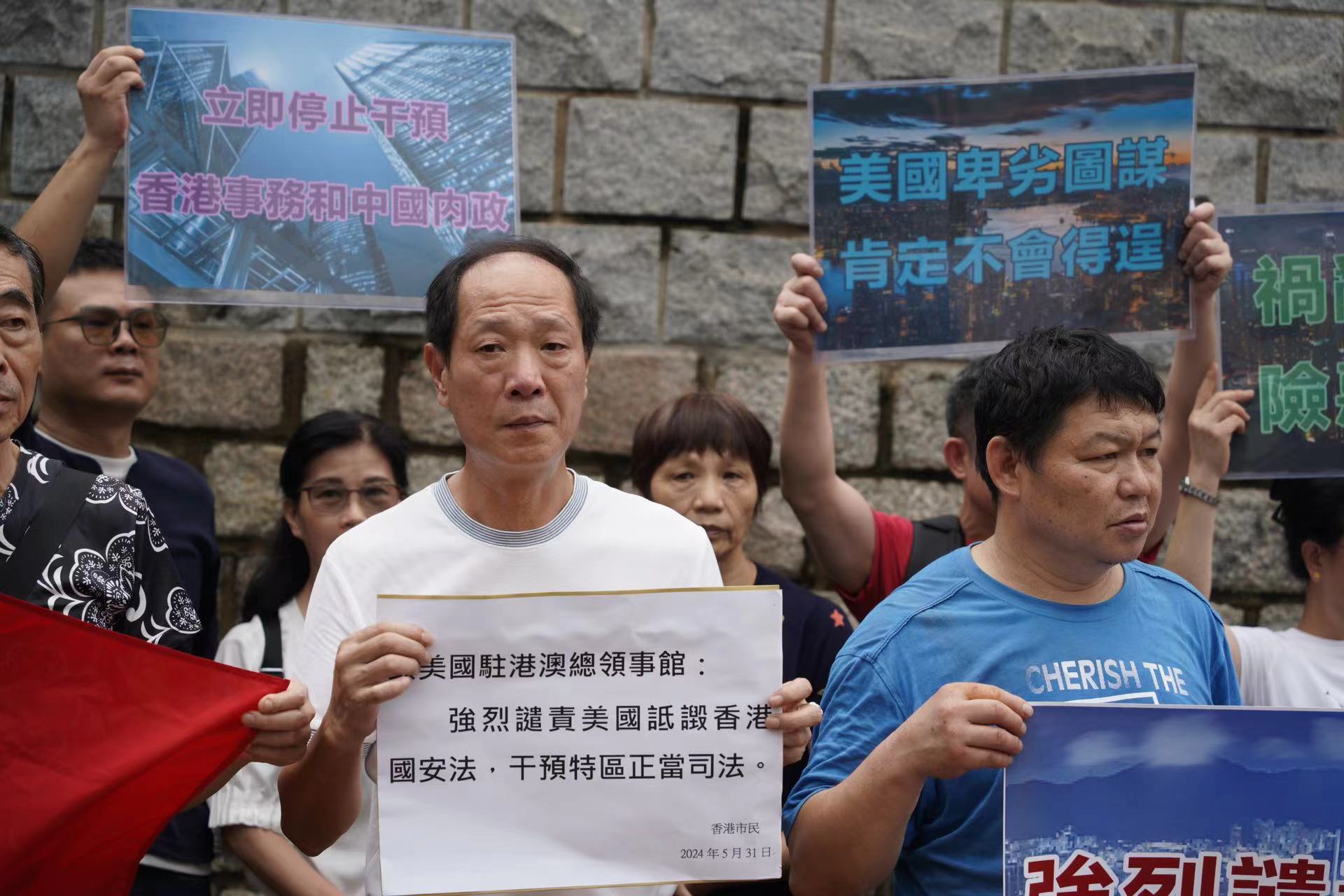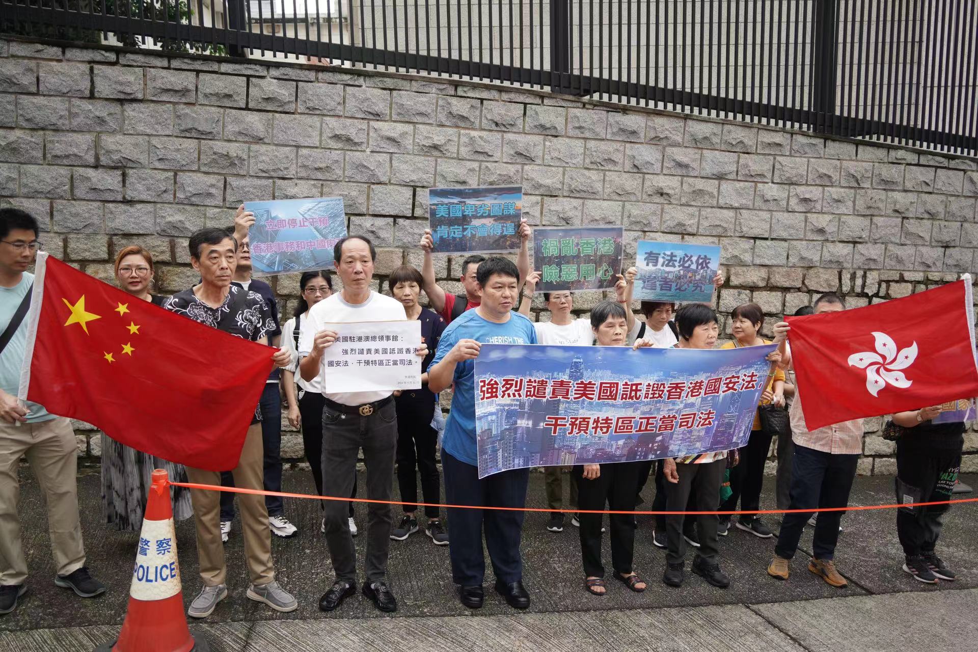 市民們高喊「堅決維護國家安全」「有法必依、違法必究」「美國卑劣圖謀肯定不會得逞」等口號,奉勸美國正視現實,秉持客觀公正的立場,尊重香港特區法治,立即停止干涉香港事務和中國內政。