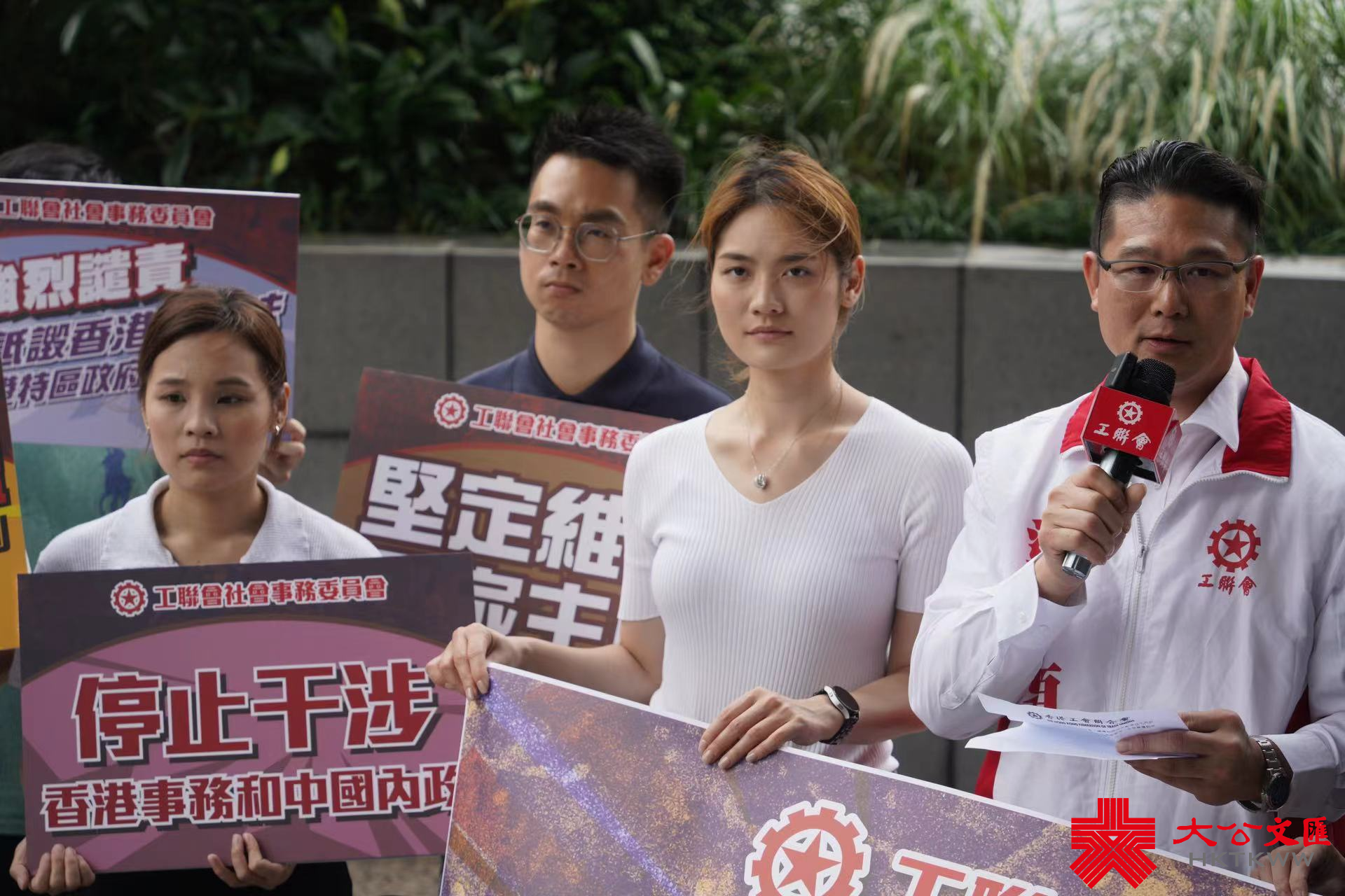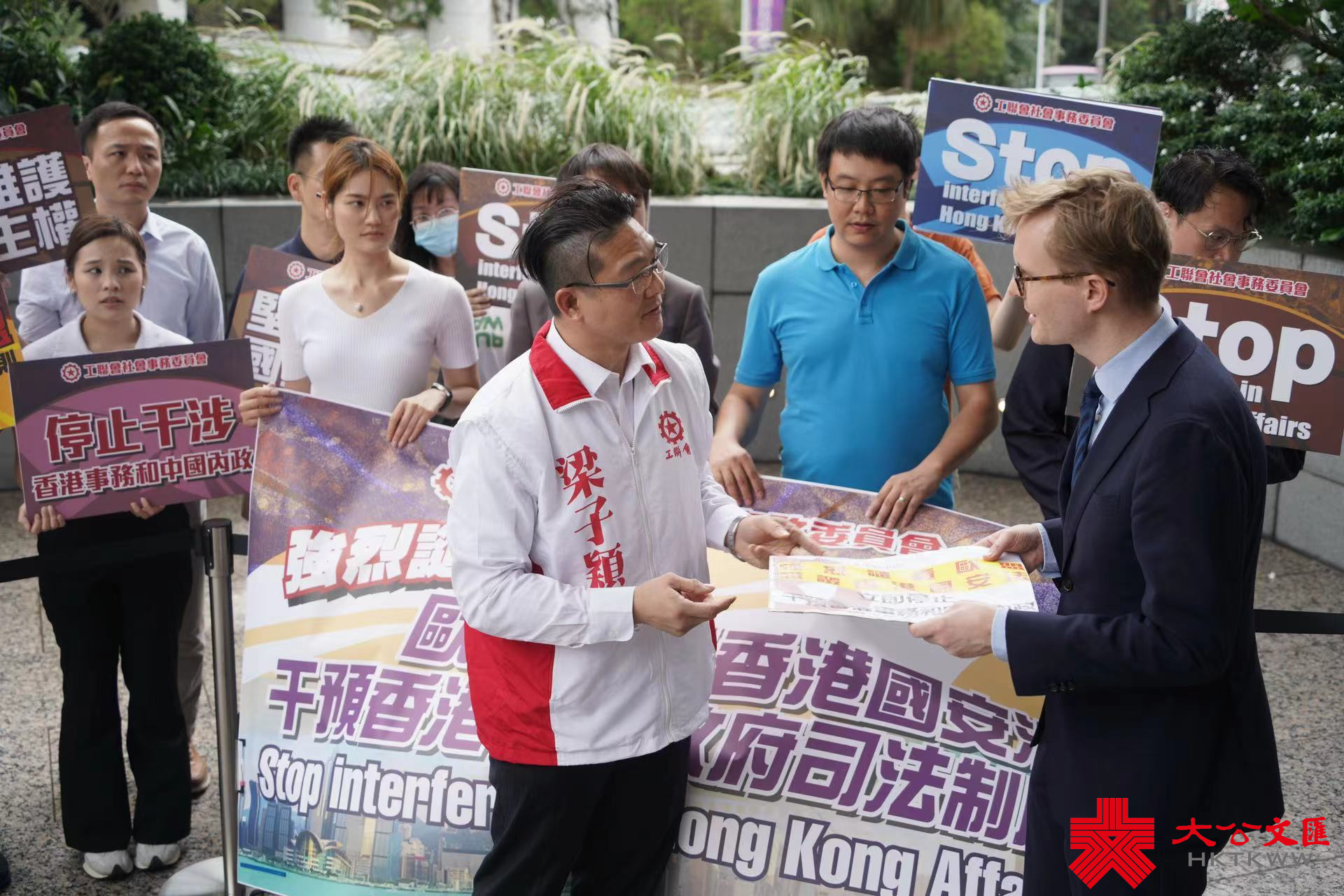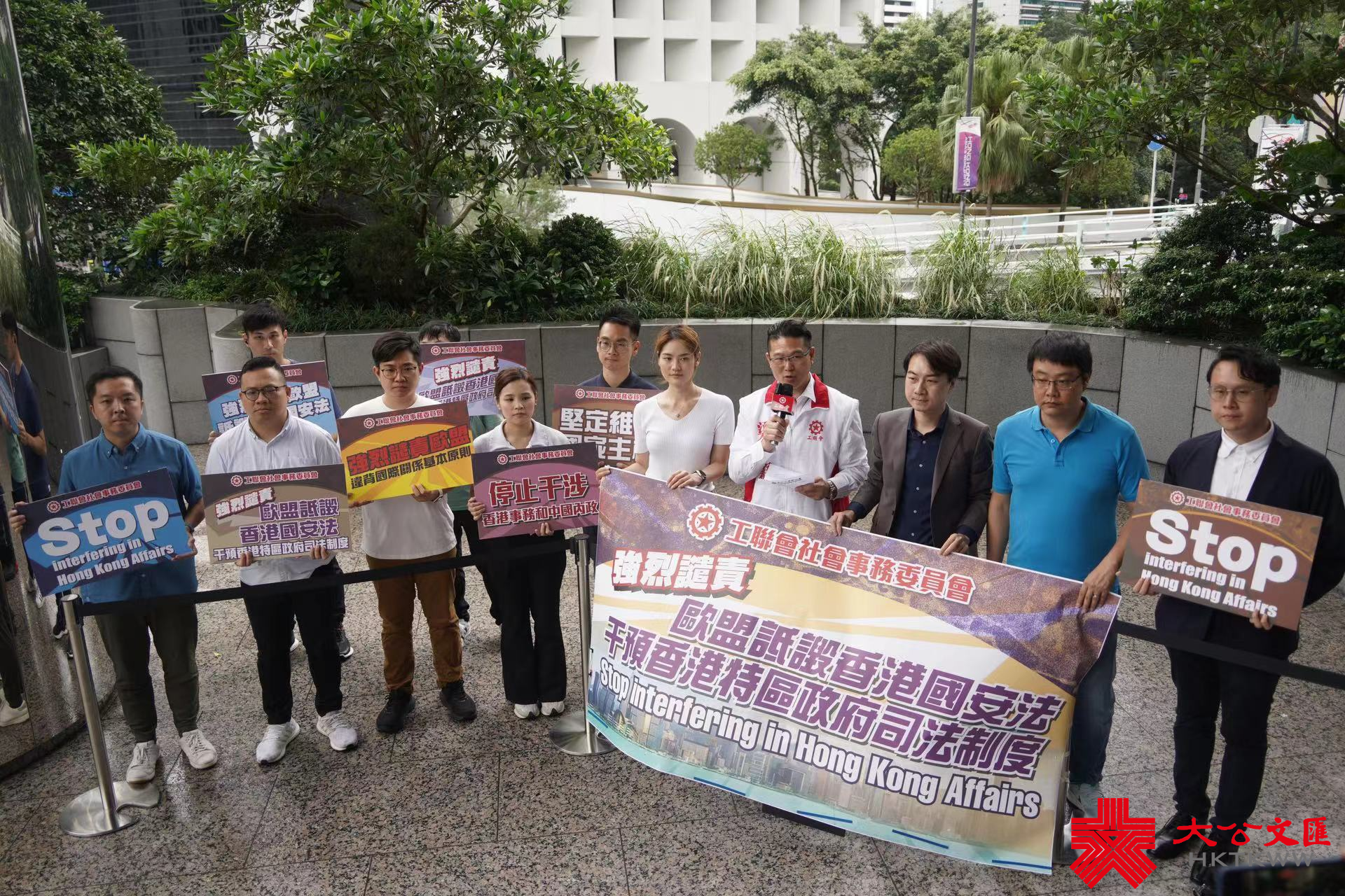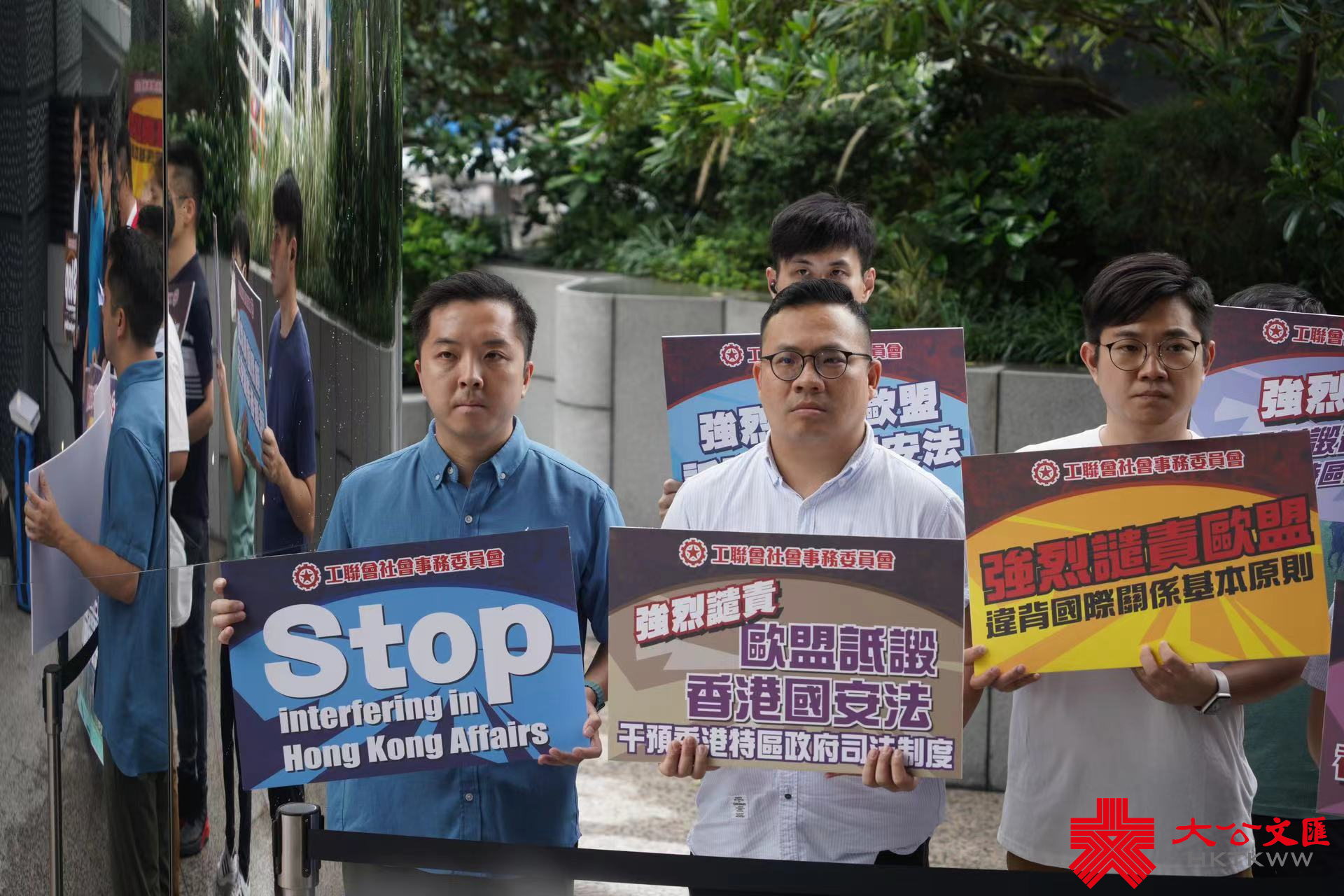 工聯會社會事務委員會今日下午在歐洲聯盟駐香港辦事處樓下示威,抗議歐盟為違法亂紀的反中亂港分子撐腰,立法會議員梁子穎帶頭譴責。其間,歐盟駐港辦事處工作人員出面接受抗議信。