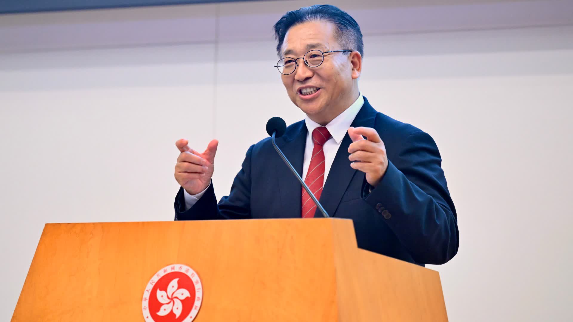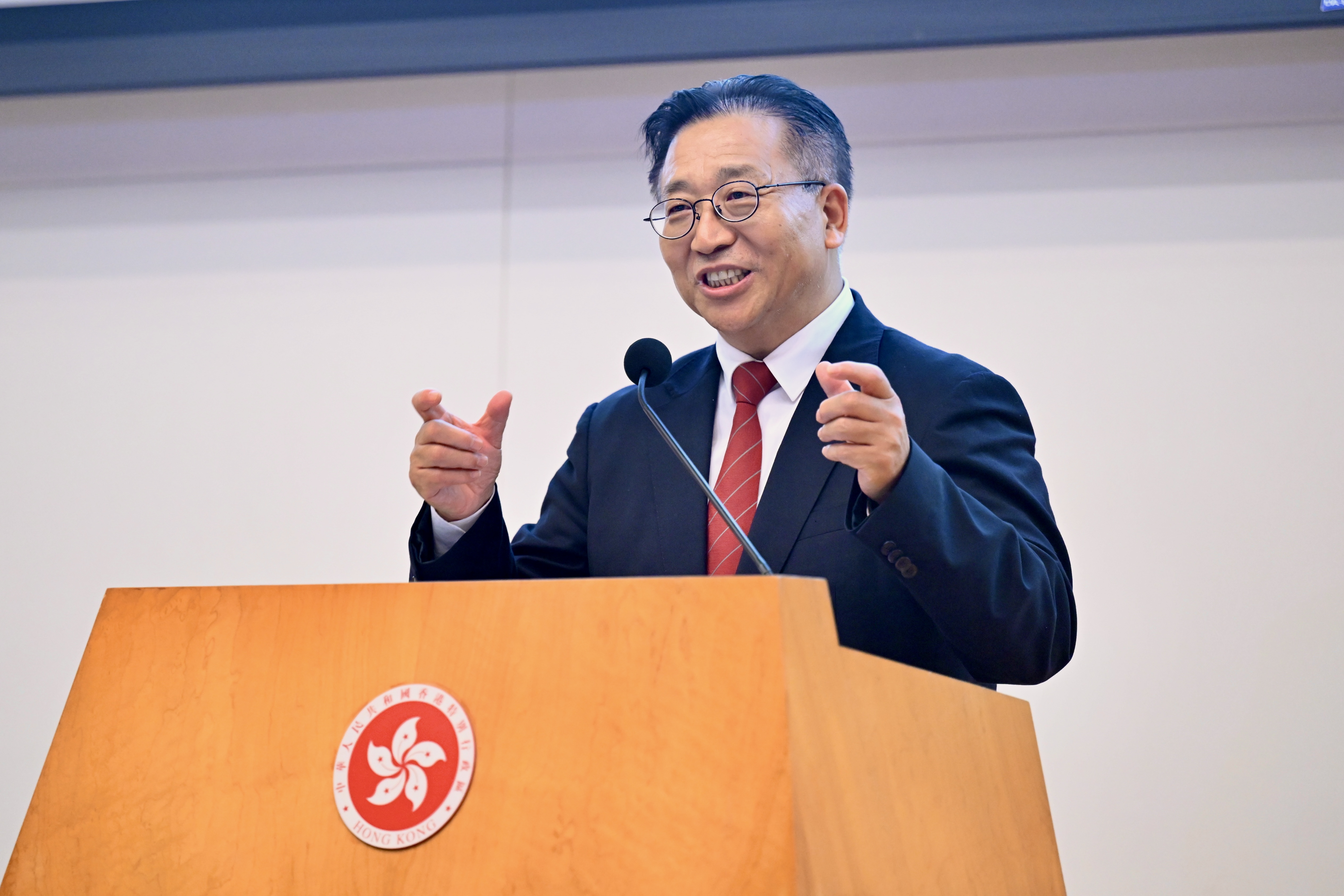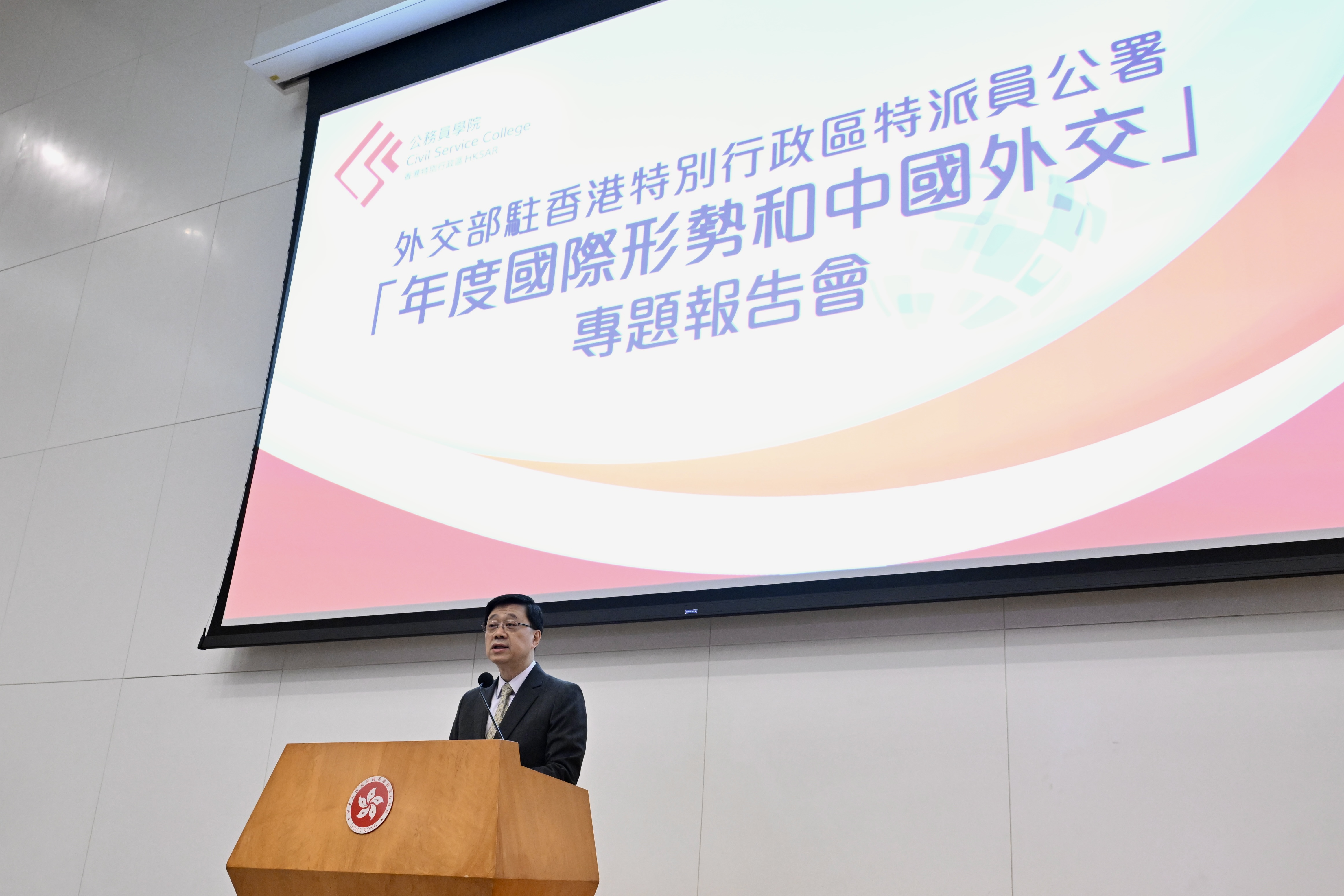 李家超在報告會上致開場發言。他感謝崔建春特派員出席報告會,分析複雜嚴峻的國際政經形勢和國家的外交策略,讓特區政府能更好地配合國家應對國際競爭環境,同時貢獻國家高質量發展。
