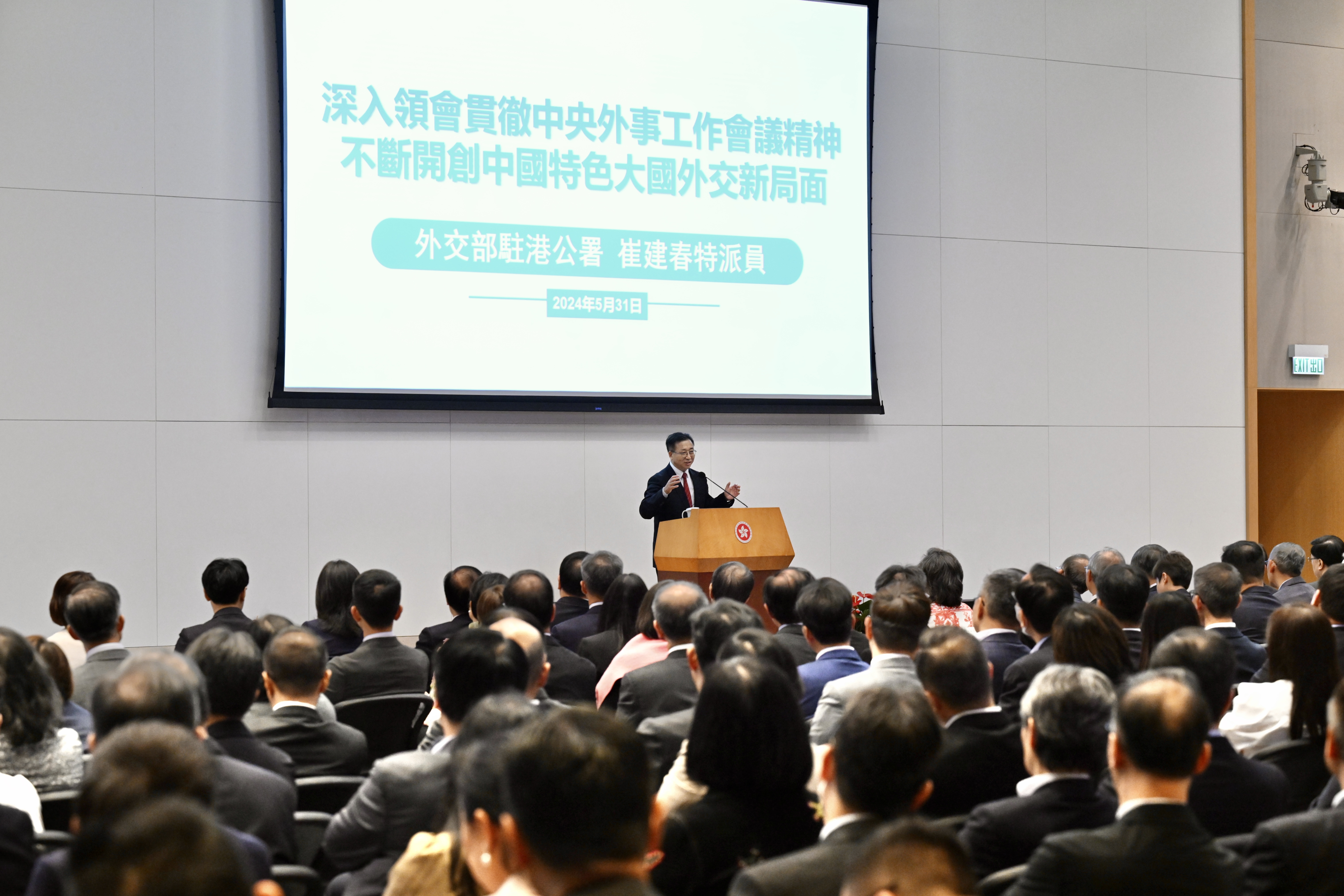 崔建春深刻分析了當前國際形勢,並結合外交實踐為特區公務員解讀中央外事工作會議精神,介紹中國外交十方面歷史性成就和六條寶貴經驗。崔建春強調,香港在「一國兩制」框架下具有十方面獨特優勢,外交公署將着力服務香港發展,維護香港獨特優勢、助力香港更好融入國家發展大局。