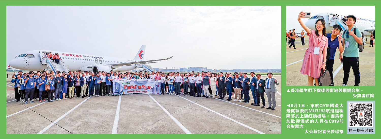 (大公報 記者 倪夢璟 上海報道)6月1日15時56分,當東航C919國產大飛機執飛的MU7192航班自香港飛抵上海虹橋機場,機艙中120餘名港生興奮鼓掌。有港生忍不住讚嘆:「真的坐上了國產大飛機,整個行程又靜又穩,親身體驗到國家航空發展的非凡成就,非常自豪。」這是C919首次執飛跨境商業包機,承運參加「滬港同心 相聚上海」香港青年學生實習計劃的香港大學生。