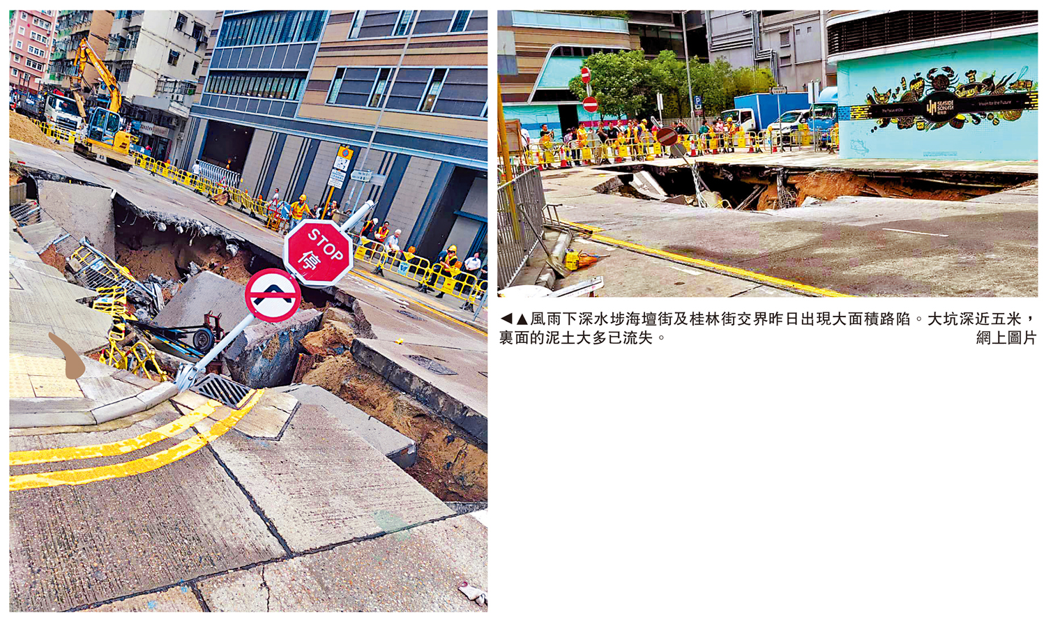 (大公報 記者 盛德文)本港近年受極端天氣影響,出現嚴重水浸和山泥傾瀉。熱帶氣旋「馬力斯」的強風暴雨襲港下,深水埗海壇街昨日發生嚴重路陷,出現長10米深約5米的巨坑,當局要緊急封閉道路維修,交通嚴重受阻。