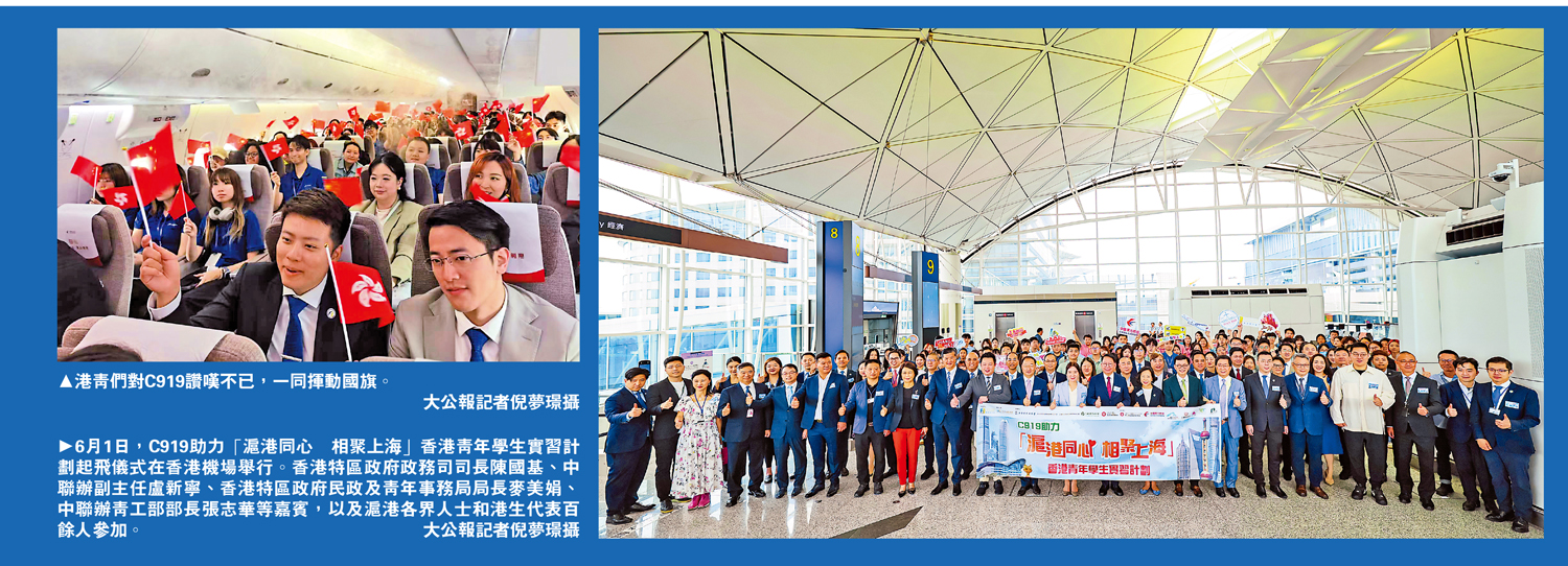 (大公報 記者 倪夢璟、張帆)C919助力「滬港同心 相聚上海」香港青年學生實習計劃6月1日正式啟動。起飛儀式後,120名香港大學生作為國產大飛機C919首次跨境商業飛行的首批香港乘客登上飛機,前往上海展開為期七周的實習生活,對促進青年交流有重要意義。